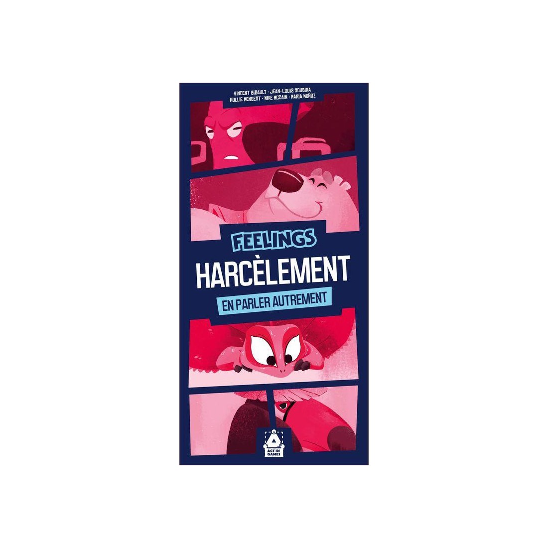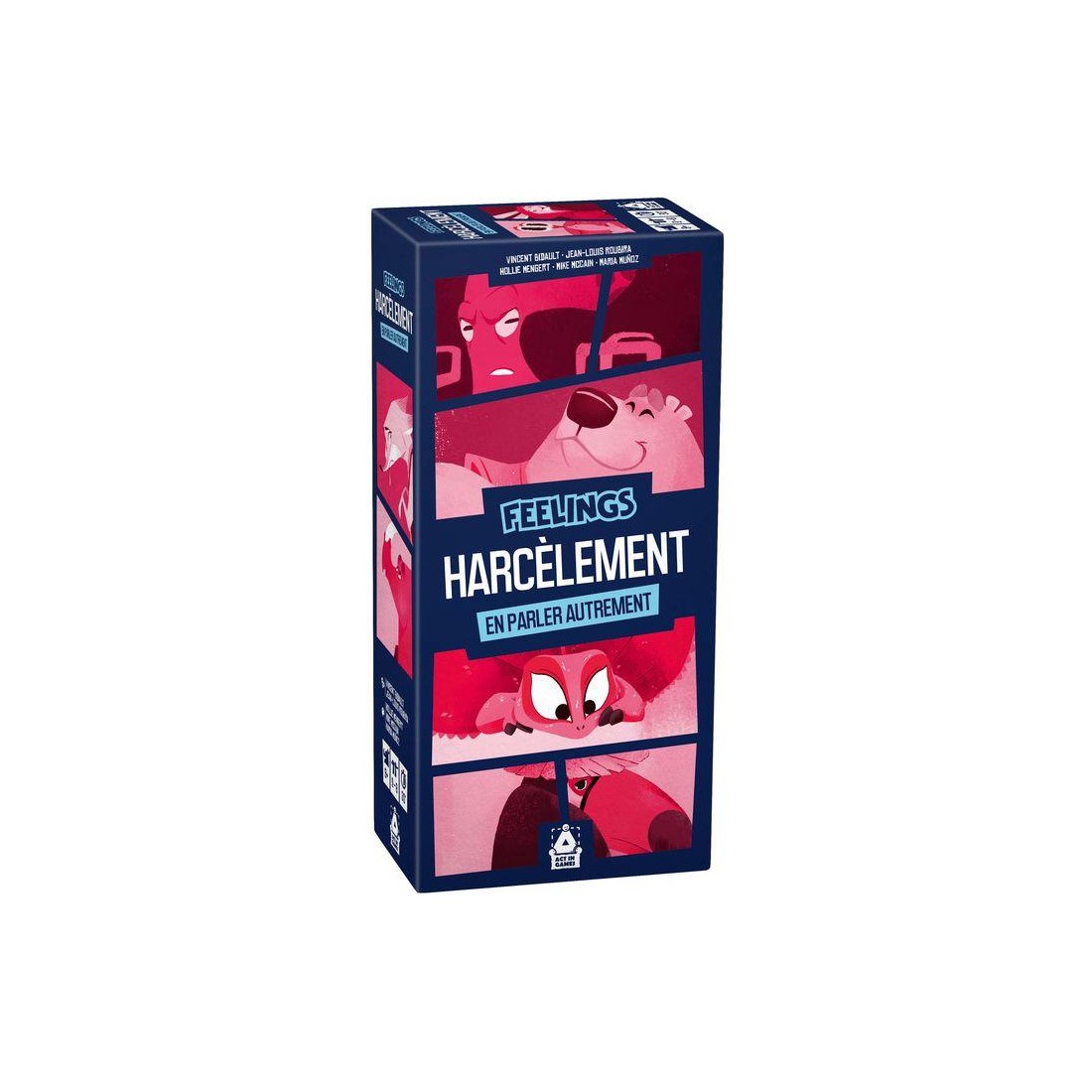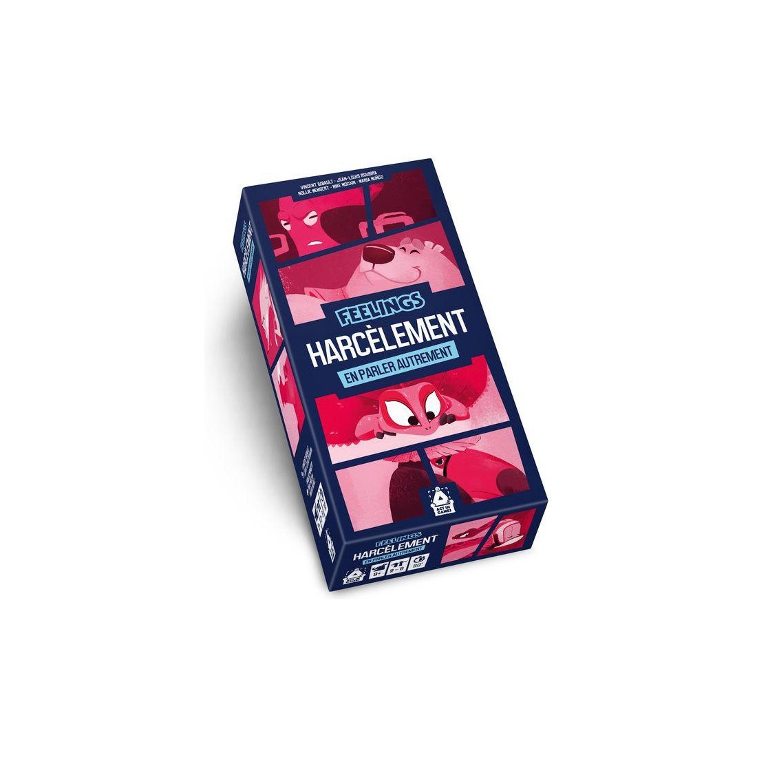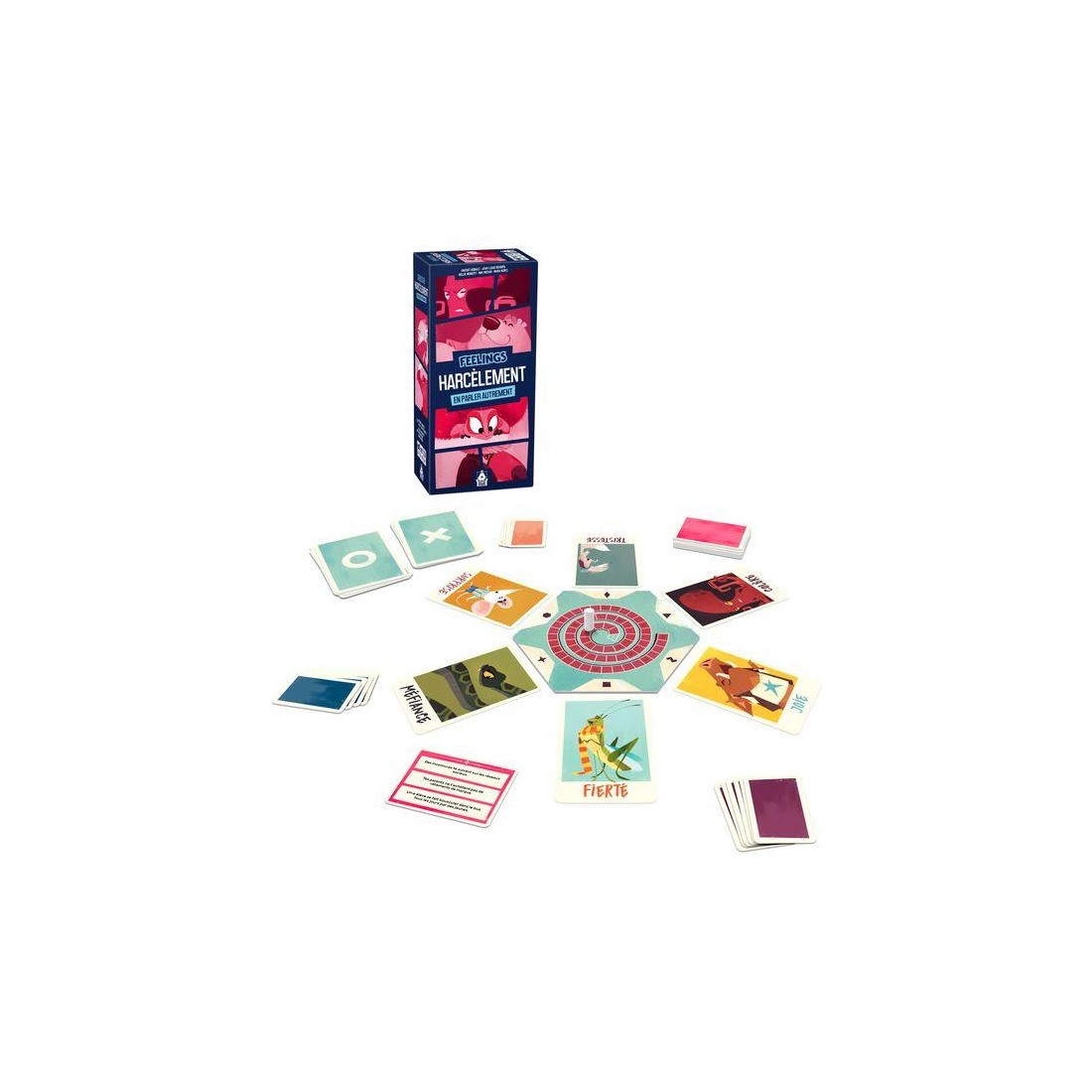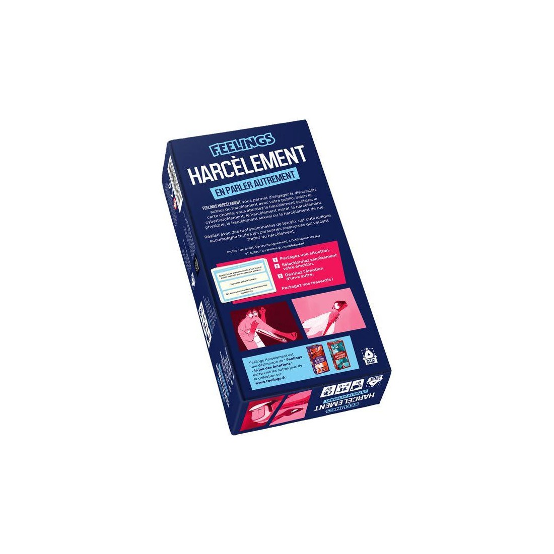 Il reprend la mécanique de jeu de Feelings avec une carte Situation en lien avec le harcèlement _ qu’il soit moral, physique, scolaire, de rue, de genre ou cyber_ lue à haute voix. Les personnes autour de la table sont invitées à choisir une des six cartes émotions positionnées autour du plateau pour exprimer ce qu’elles ressentiraient dans ce genre de situation.