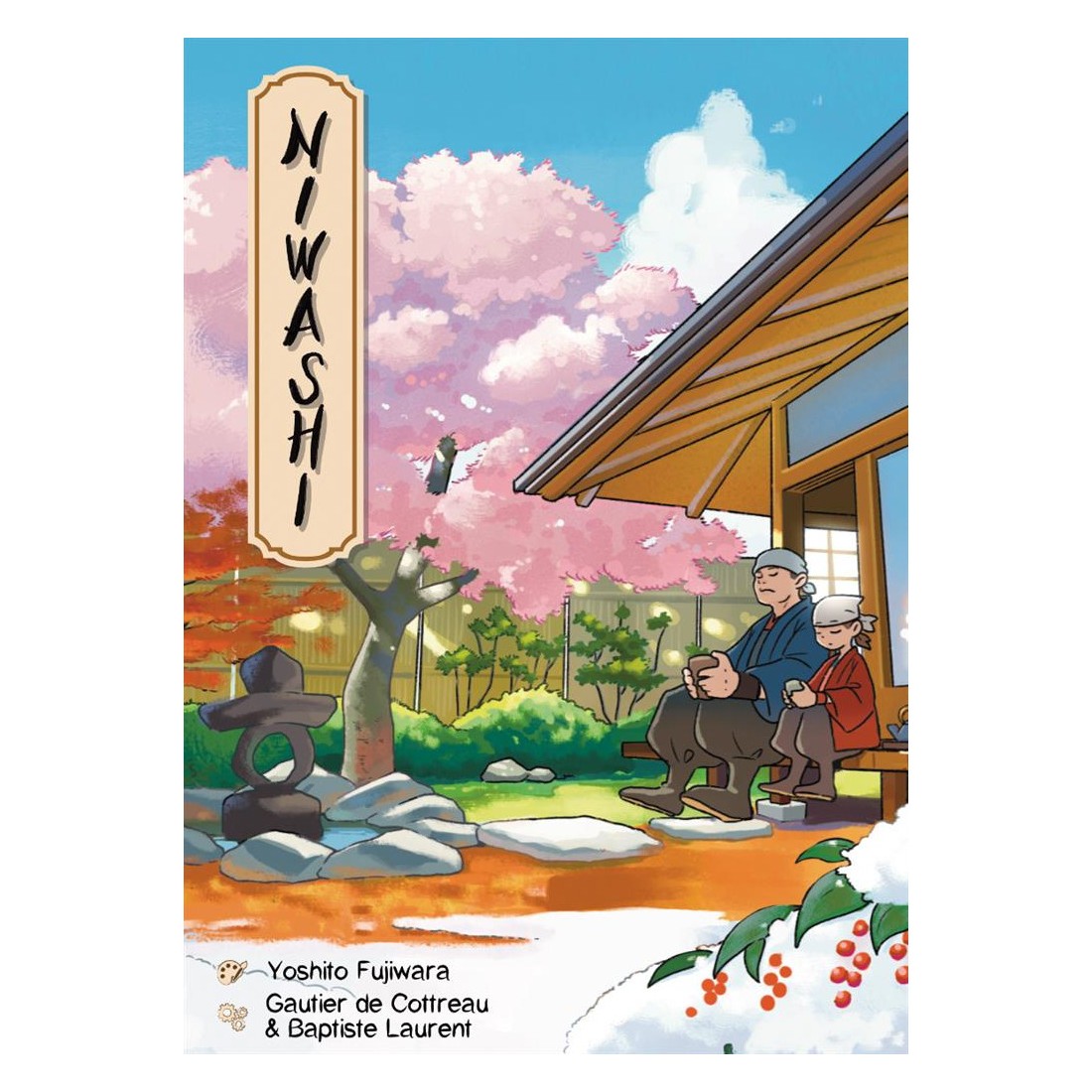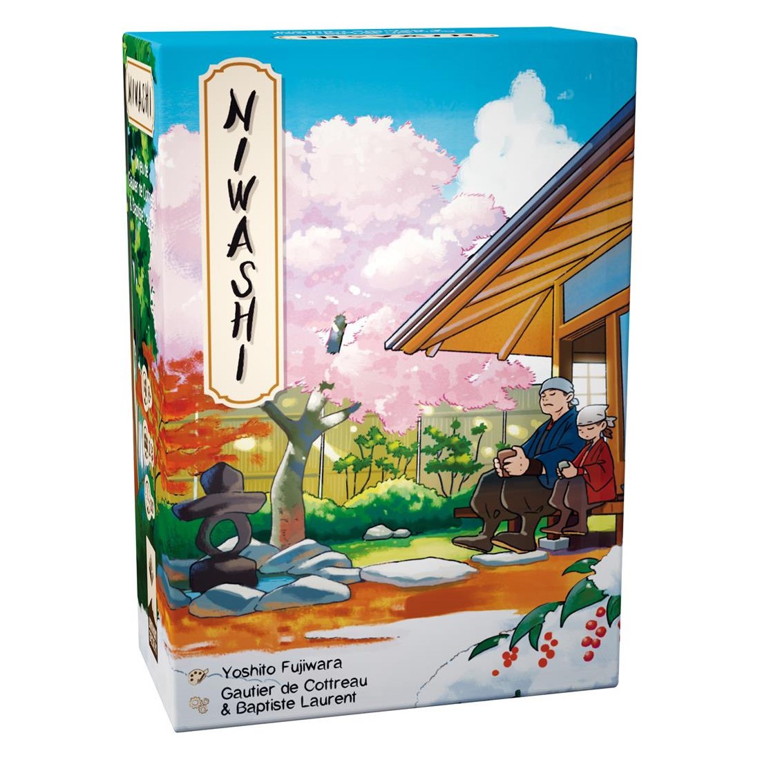 Vous êtes deux nouveaux jardiniers chargés de l’entretien des jardins du Nantoka-Ji. Suivez les instructions du moine pour remplir les objectifs. Pendant une partie de Niwashi, les deux partenaires construisent ensemble un jardin en essayant de compléter un maximum d’objectifs. A tour de rôle, et en respectant la quiétude des lieux, les joueurs placent une tuile Jardin ou donnent des indications à leur partenaire grâce à la Lanterne, car il est interdit de communiquer directement ! En effet, vous ne pouvez parler durant la partie. À vous de faire comprendre vos objectifs à la manière dont vous placez vos tuiles, vos couleurs et votre lanterne. Les tuiles sont des ‘triples’ dominos remplis de 3 parcelles correspondant aux saisons (plus du sable). Posez-en une à votre tour, de manière orthogonale, et en recouvrant au minimum une ou deux parcelles déjà présentes. Ce faisant, vous formerez peut-être les motifs demandés par les Objectifs ! Si vous avez besoin que votre partenaire vous aide, placez le pion Lanterne au bon endroit pour qu’il comprenne vos besoins. Tentez d’obtenir le meilleur score possible, puis passez au Voyage, la partie défis du jeu, pour les jardiniers les plus expérimentés ! Contenu :- 62 tuiles Jardin