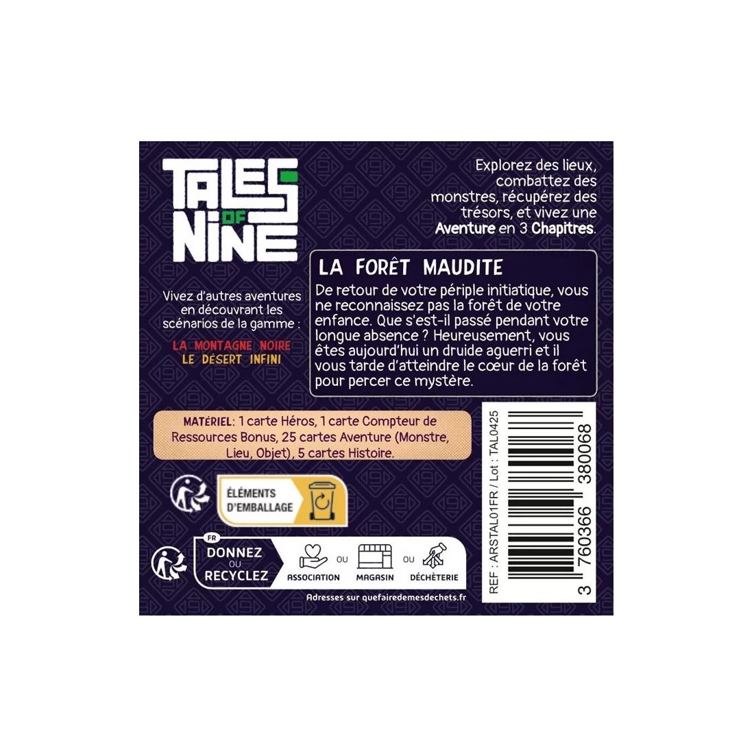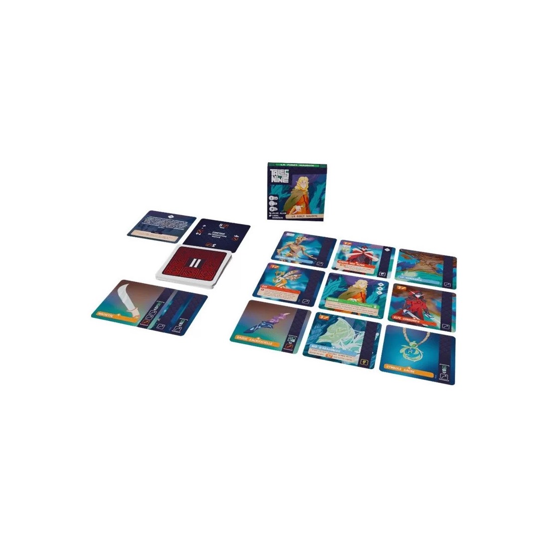 Dans Tales of Nine 2 : La Forêt Maudite, explorez des lieux, combattez des monstres, collectez des trésors et vivez une aventure en 3 chapitres. De retour de votre périple initiatique, vous ne reconnaissez pas la forêt de votre enfance. Que s'est-il passé pendant votre longue absence ? Heureusement, vous êtes aujourd'hui un druide aguerri et il vous tarde d'atteindre le coeur de la forêt pour percer ce mystère.Chaque boîte de Tales of Nine contient 3 chapitres d’une histoire à découvrir sous forme de cartes. Huit d’entre elles sont placées autour de la carte Héros, formant la région ou le donjon à explorer.