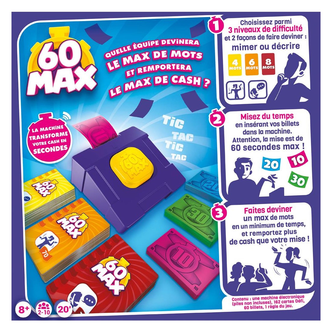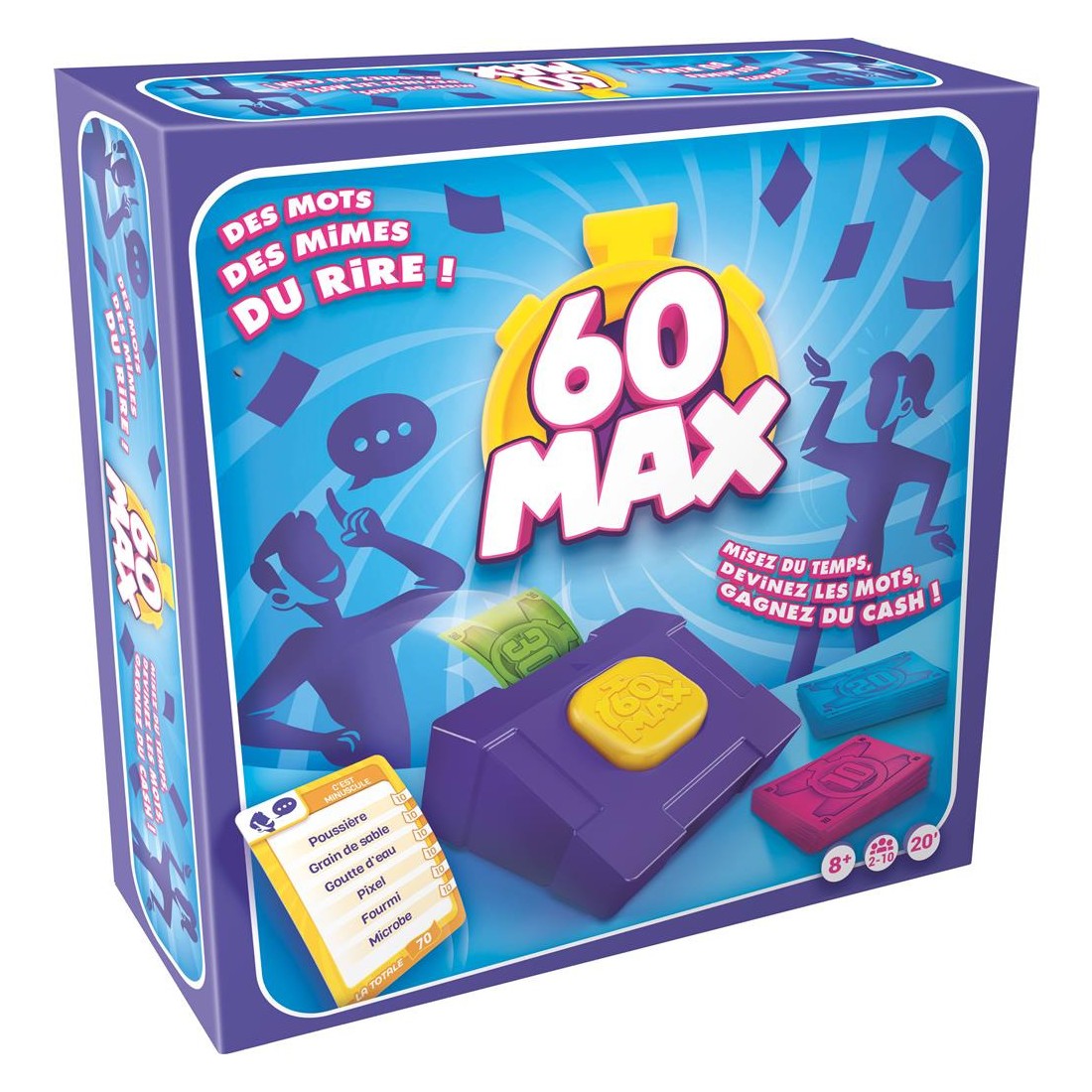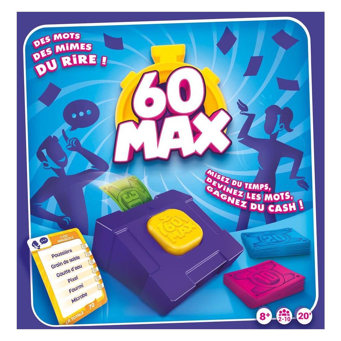 Faites deviner des listes de mots à votre équipe en mimant ou en décrivant. À vous de miser le temps qu’il vous faudra… et le temps, c’est de l’argent. Arriverez-vous à récupérer votre mise, et mieux, vous enrichir ? Mais attention, vous ne pourrez dépenser que 60 secondes… max !