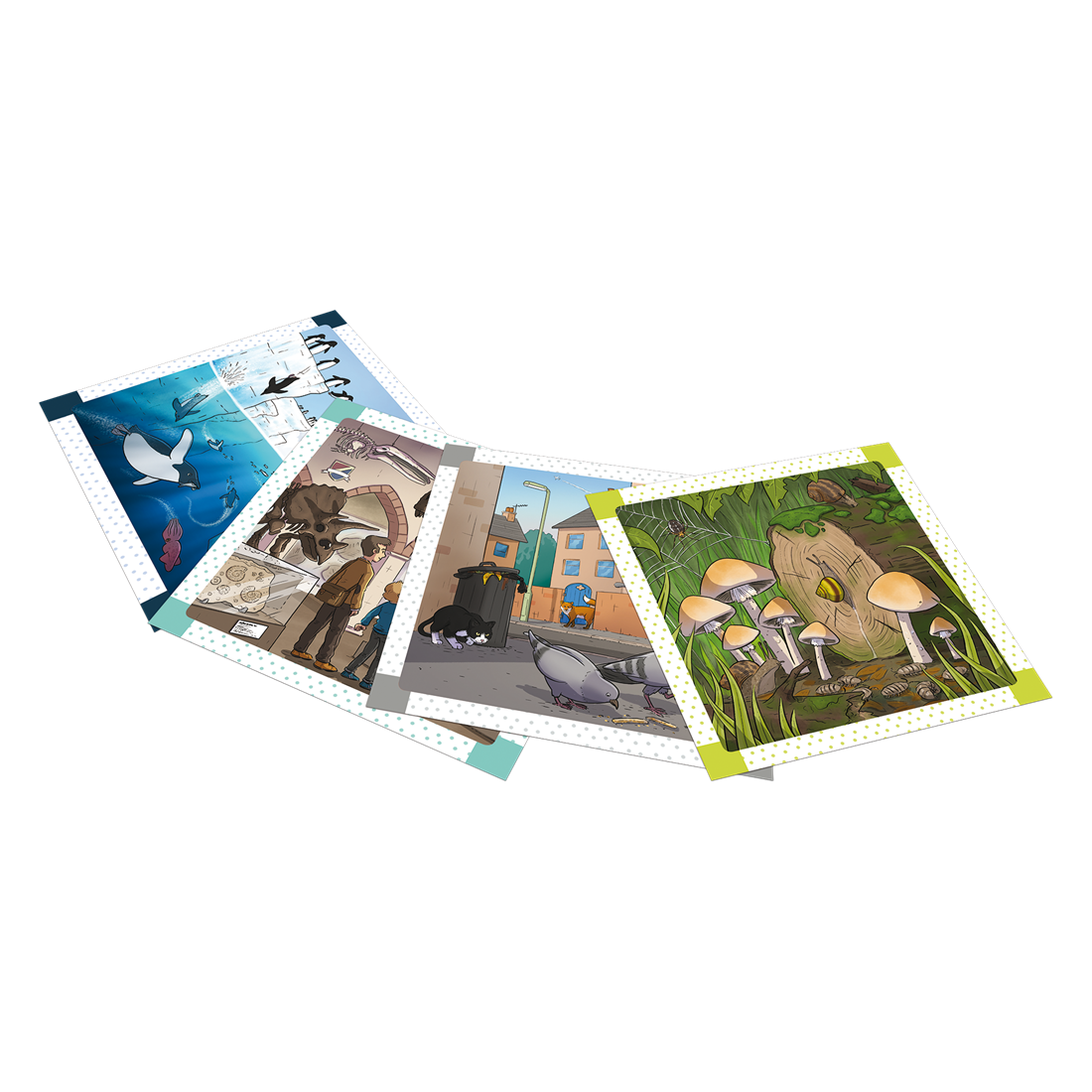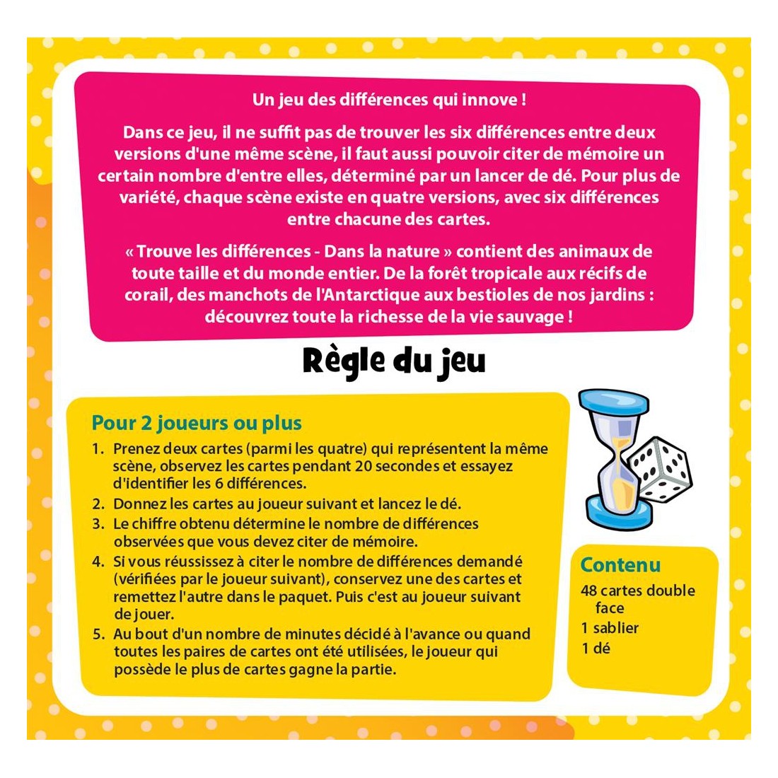 Les joueurs actifs observent deux cartes qui comportent 6 différences, puis doit, de mémoire, en citer autant qu’indiqué par le dé ! Si le but est atteint, le joueur remporte la carte. Celle ou celui qui en a le plus à la fin de la partie la gagne. Chaque illustration se trouve en 4 exemplaires, pour jouer jusqu’à quatre. « Dans la Nature » contient des animaux du monde entier, du jardin à l’Antarctique !