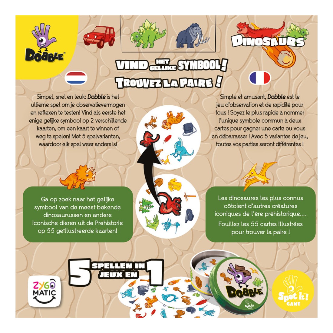 Qui n'a pas rêvé de devenir paléontologue ? Affûtez vos sens d'explorateur pour distinguer Tricératops, vélociraptors et ptérodactyles au milieu d'autres symboles évocateurs de l'ère jurassique. Partez à la recherche du seul symbole commun entre 2 cartes grâce à votre sens de l’observation, votre rapidité et vos réflexes.
