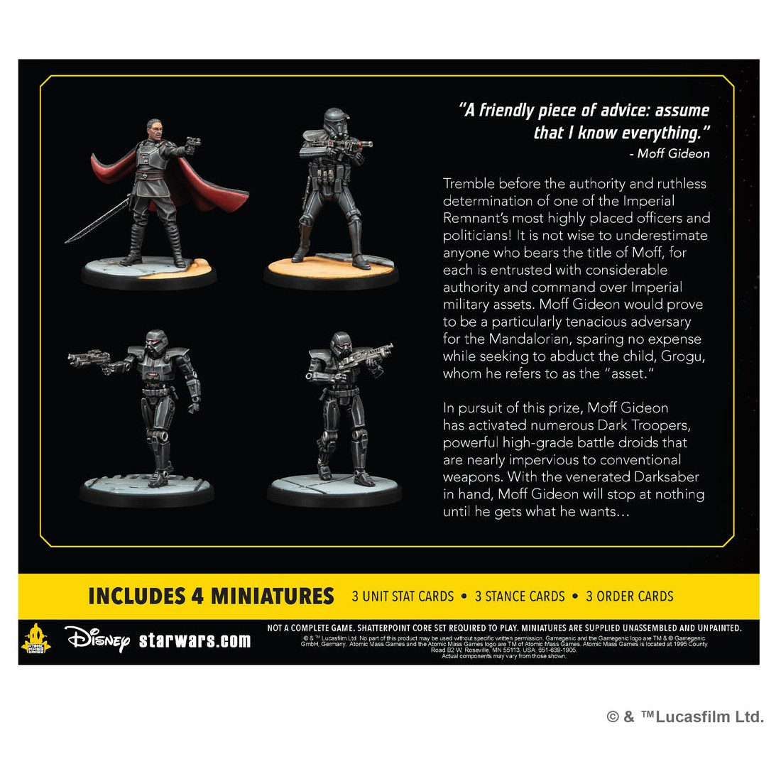 Ce pack escouade Star Wars : Shatterpoint : "Vous avez quelque chose" amène le rusé Moff Gideon dans le jeu en tant qu'unité principale. Il est rejoint par une escorte de Death Troopers en tant qu'unité secondaire et deux terrifiants Dark Troopers en tant qu'unité de soutien. Ensemble, ils forment une escouade intimidante datant de la guerre civile galactique, prête à être déployée. Alternativement, ils peuvent être combinés avec d’autres unités de cette époque pour former une escouade personnalisée. Ce pack est complété par toutes les cartes Stat, Position et Ordre dont les joueurs ont besoin pour les aligner au combat.Titre en Vo : Star Wars Shatterpoint - You Have Something-Want Squad Pack