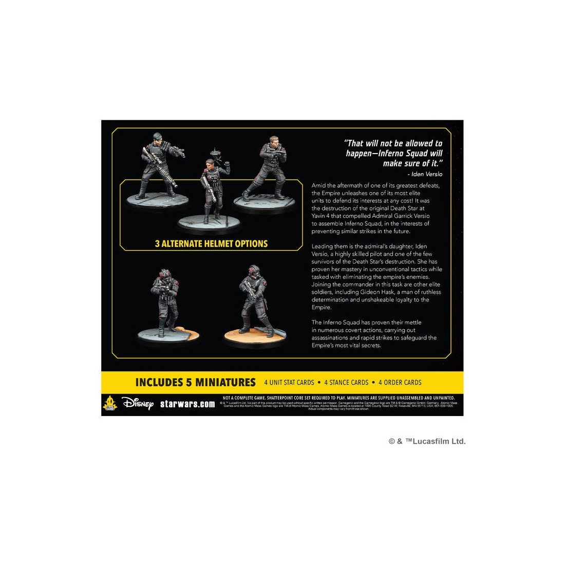 Star Wars : Shatterpoint : Today the Rebellion dies est une extension escouade pour Star Wars Shatterpoint, dès 14 ans, pour deux joueurs, pour des parties de 90 minutes, édité par Atomic Mass Games. "Cela ne sera pas autorisé, Inferno Squad s'en assurera." - Iden Versio Au lendemain de l'une de ses plus grandes défaites, l'Empire libère l'une de ses unités les plus élitistes pour défendre ses intérêts à tout prix !