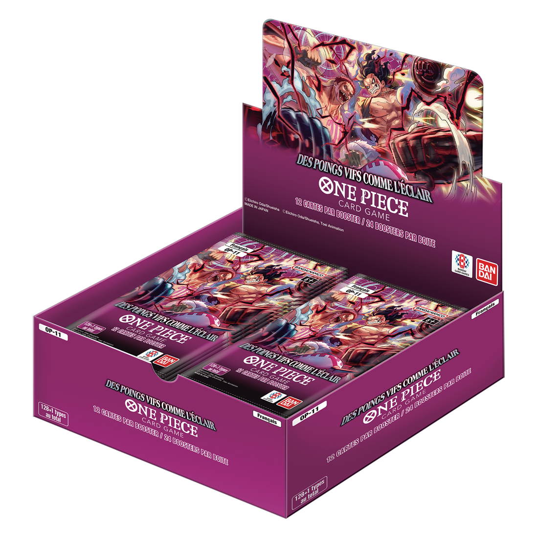 One Piece : Le Jeu de Cartes - OP11 Des poings vifs comme l'éclaire - Display de 24 Boosters est une boîte de boosters édité par Bandaï. Cette extension renforce les thèmes de l'arc Whole Cake Island et de l'arc de l'île des Hommes-Poissons ! De nombreux personnages du nouveau thème « Sword » font leur apparition !
