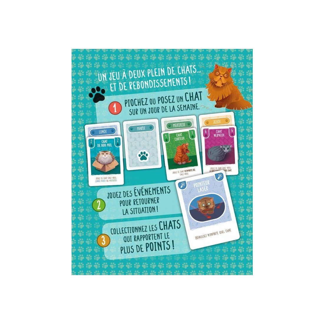 Enfin, vous pourrez tirer profit des cartes Événement pour subtiliser, défausser ou échanger des chats, et retourner ainsi la situation à votre avantage ! Dès qu'un joueur a rempli toute sa semaine, la partie prend fin : le joueur avec le plus de points sur les chats devant lui l'emporte.