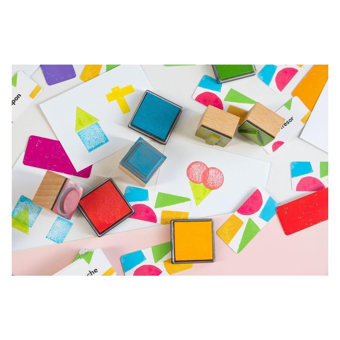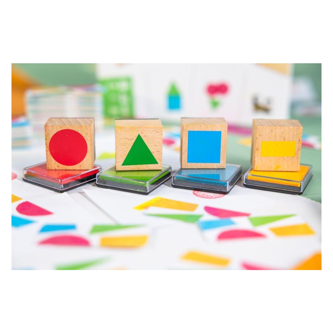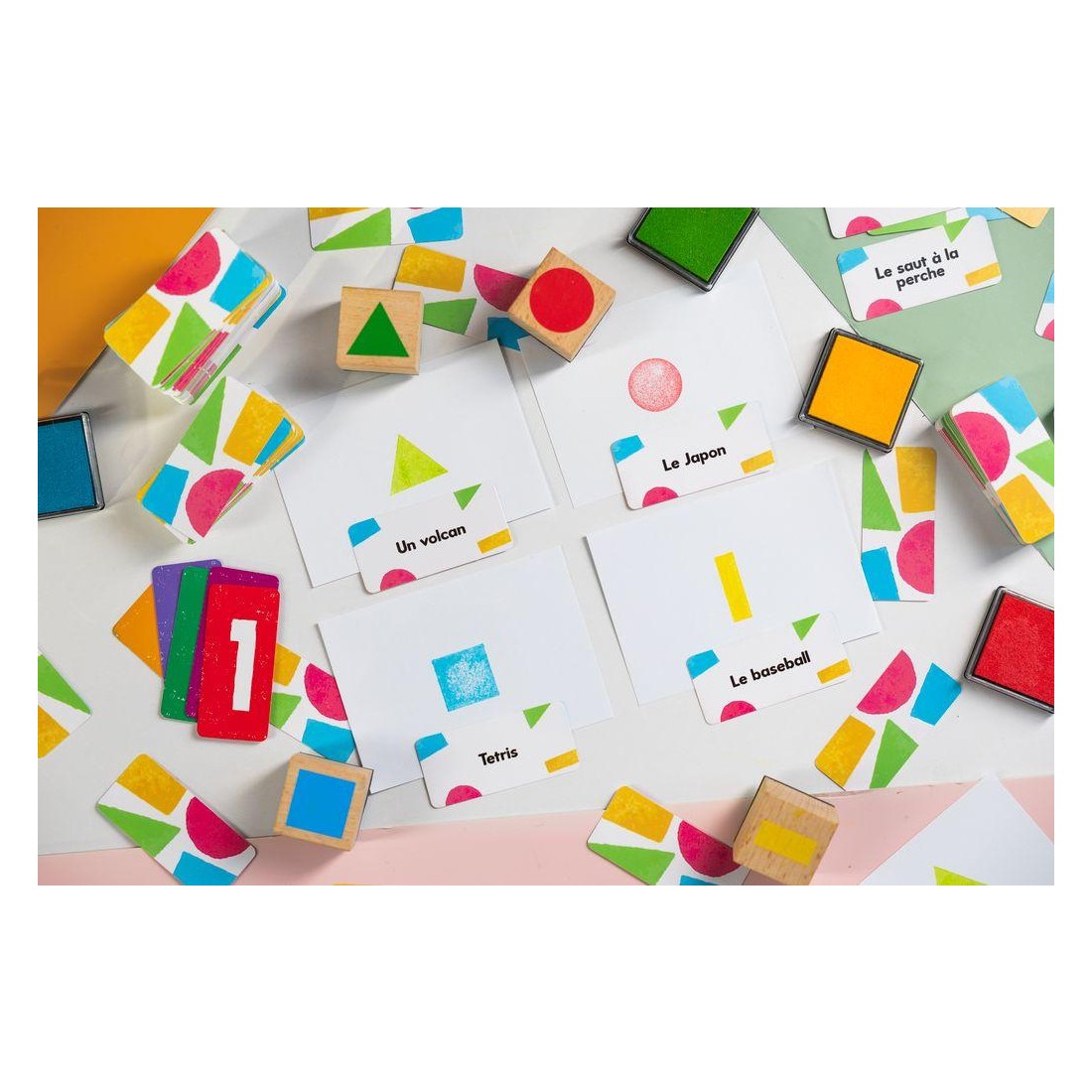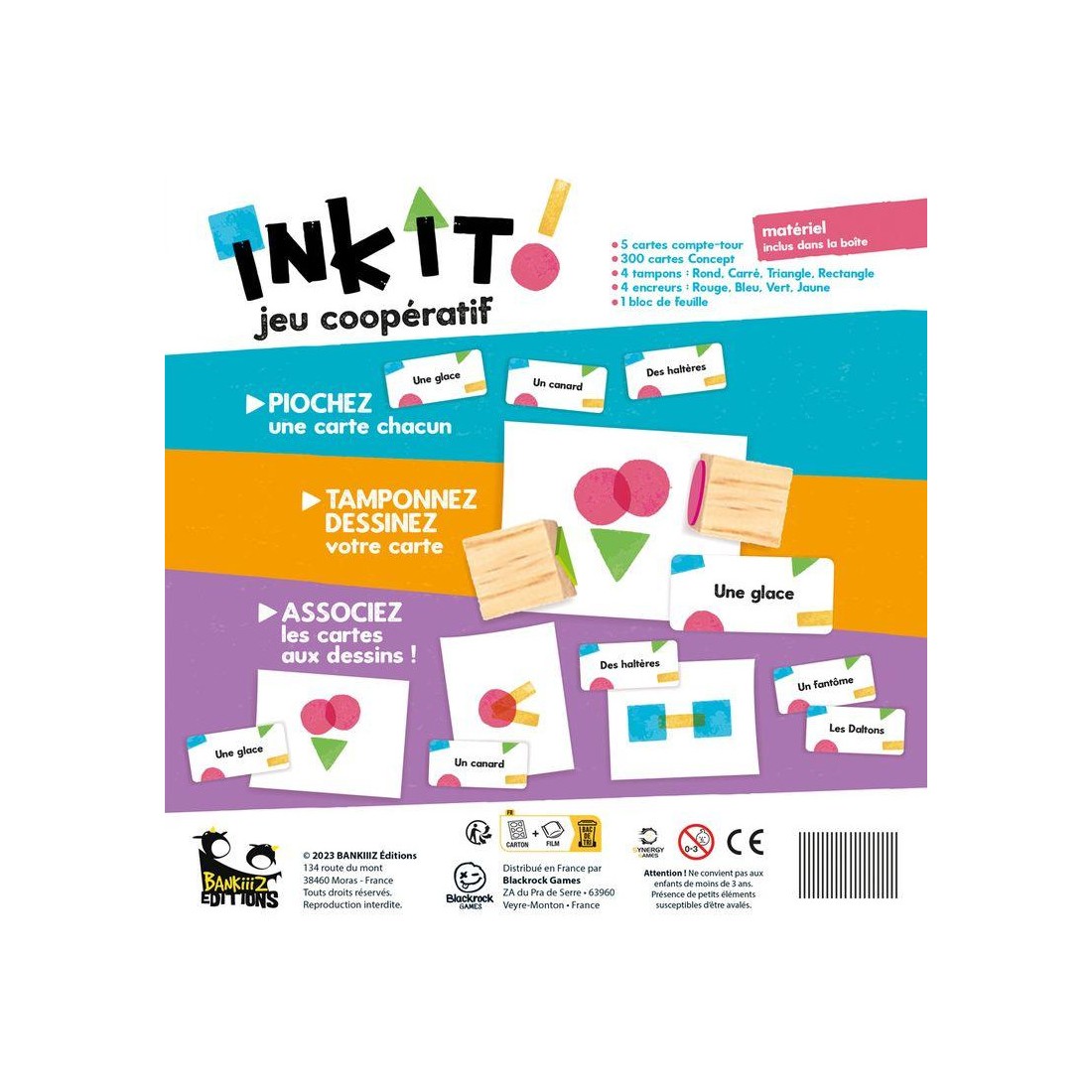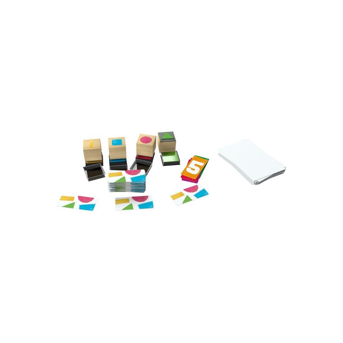 Contenu : 5 cartes compte-tour, 300 cartes Concept, 4 tampons : Rond, Carré, Triangle, Rectangle, 4 encreurs : Rouge, Bleu, Vert, Jaune, 1 bloc de feuille, livret de règles