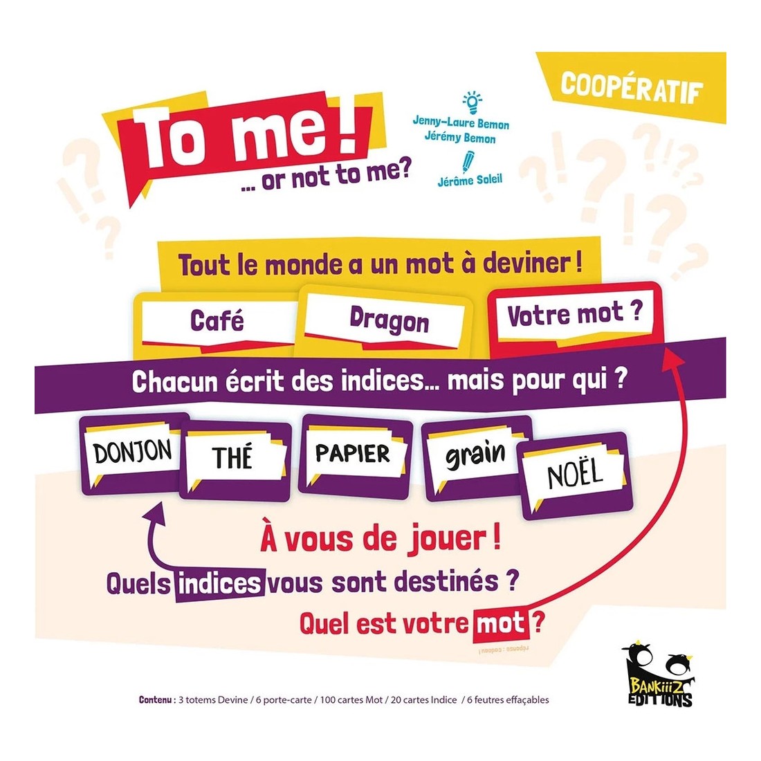 Dans le jeu de société To Me !, la communication devient un véritable puzzle collectif. Chaque joueur possède un mot secret placé devant lui, visible de tous… sauf de lui-même. Votre objectif commun est clair : faire deviner l’ensemble des mots avant d’épuiser vos précieuses tentatives, symbolisées par les totems Devine.
