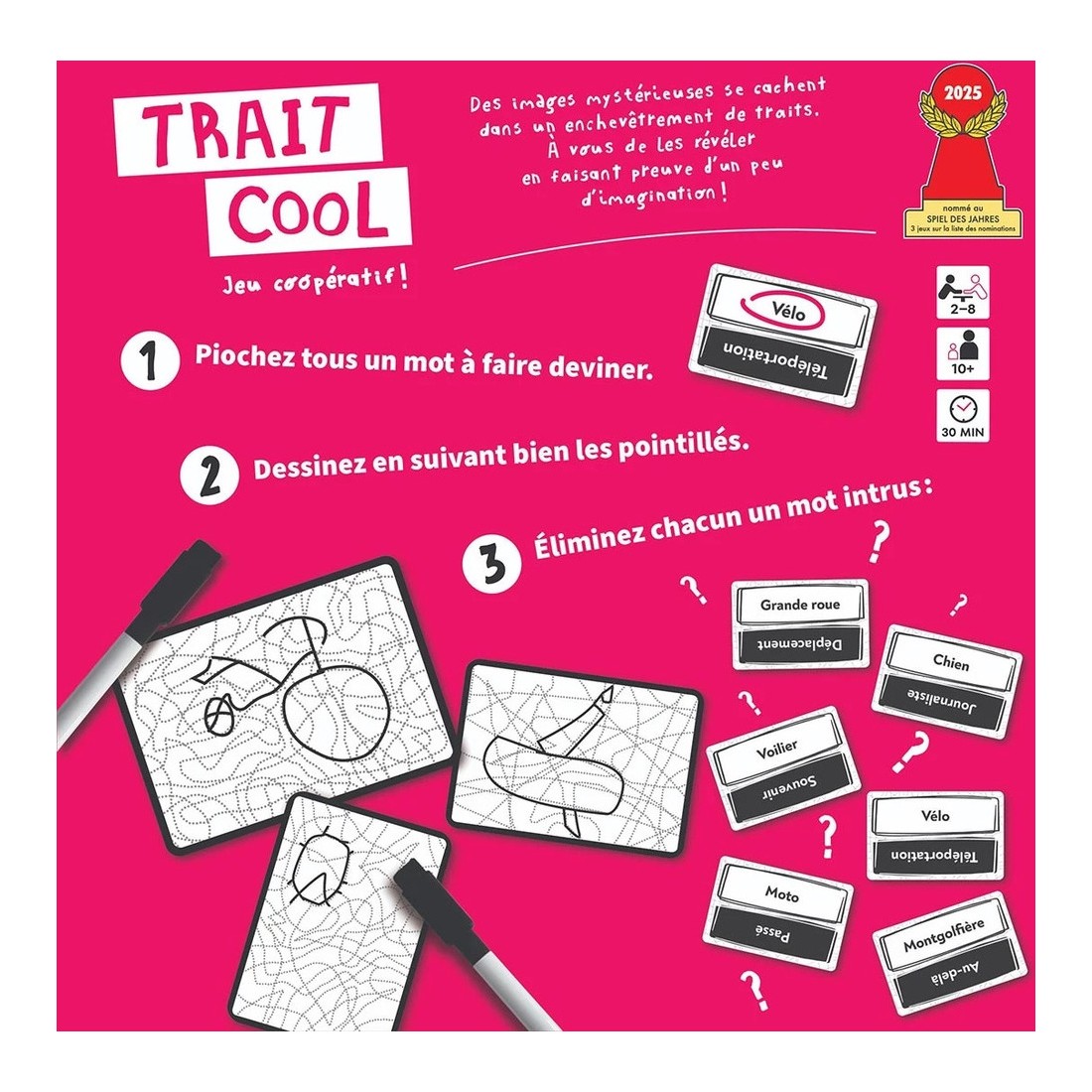 Trait Cool mise ainsi sur l’observation, l’intuition et la compréhension mutuelle plutôt que sur la performance individuelle. Accessible sans savoir dessiner, rapide à expliquer et générateur de situations souvent hilarantes, ce jeu de société coopératif de dessin est idéal pour les soirées entre amis ou en famille.
