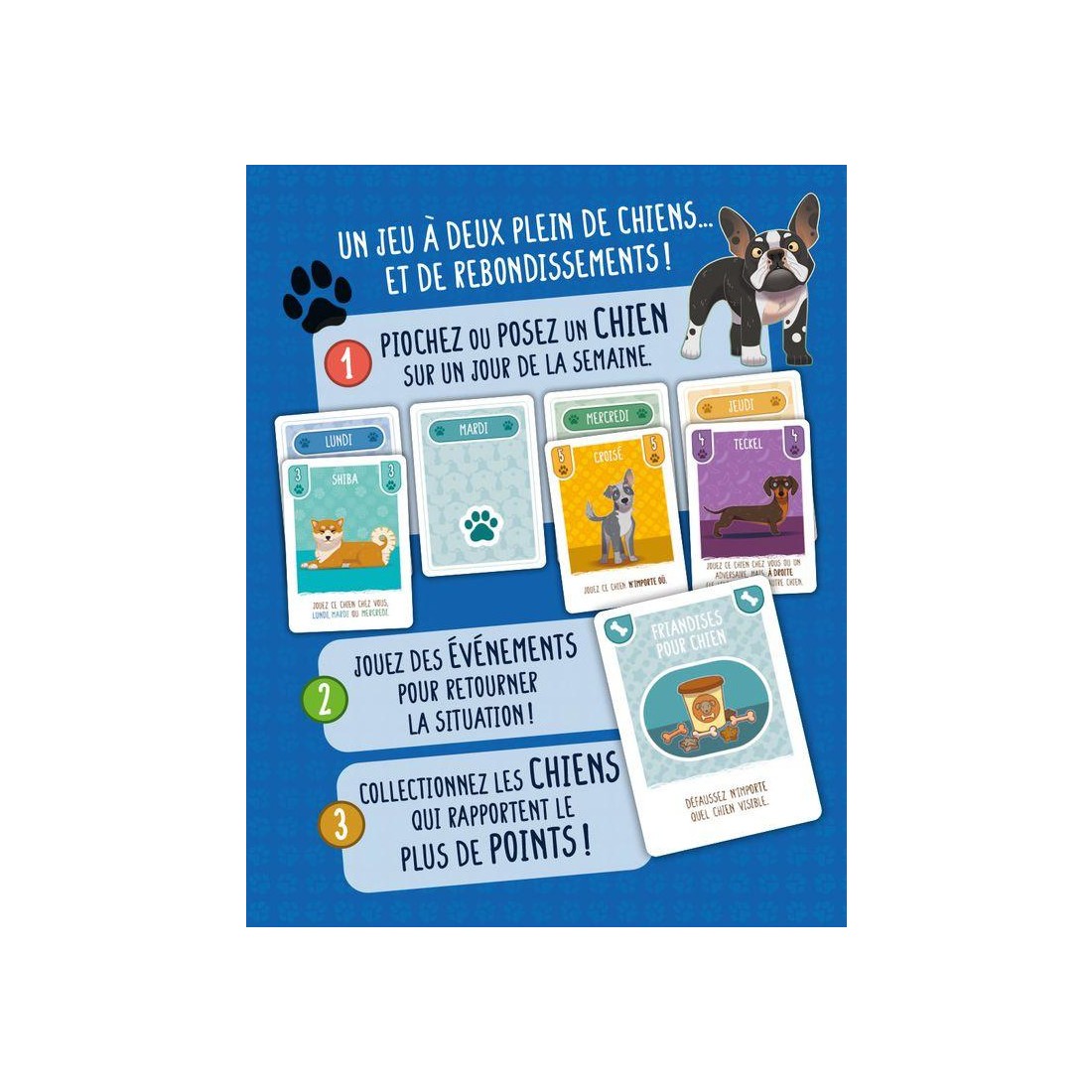 D'autres permettent de recouvrir une carte, ou de l'envoyer chez votre adversaire. Enfin, vous pourrez tirer profit des cartes Événement pour déplacer, défausser ou échanger des chiens, et retourner ainsi la situation à votre avantage ! Dès qu'un joueur a rempli toute sa semaine, la partie prend fin : le joueur avec le plus de points sur les chiens devant lui l'emporte.