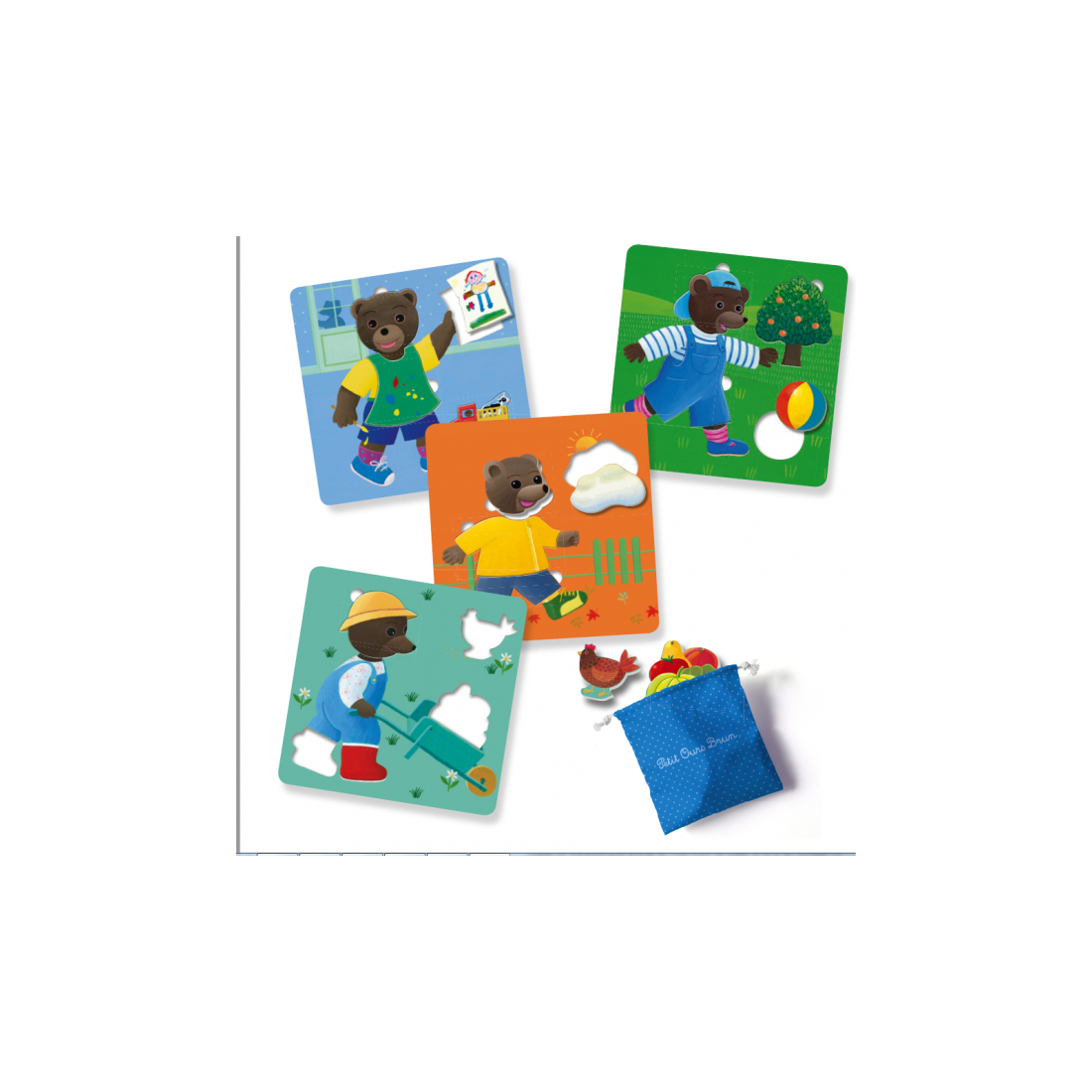 Le but du jeu : reconstituer sa planche de loto, en retrouvant les pièces au toucher dans le sac en tissu. Des grandes planches de 23 cm et des pièces encastrables, adaptées à la manipulation des tout-petits.