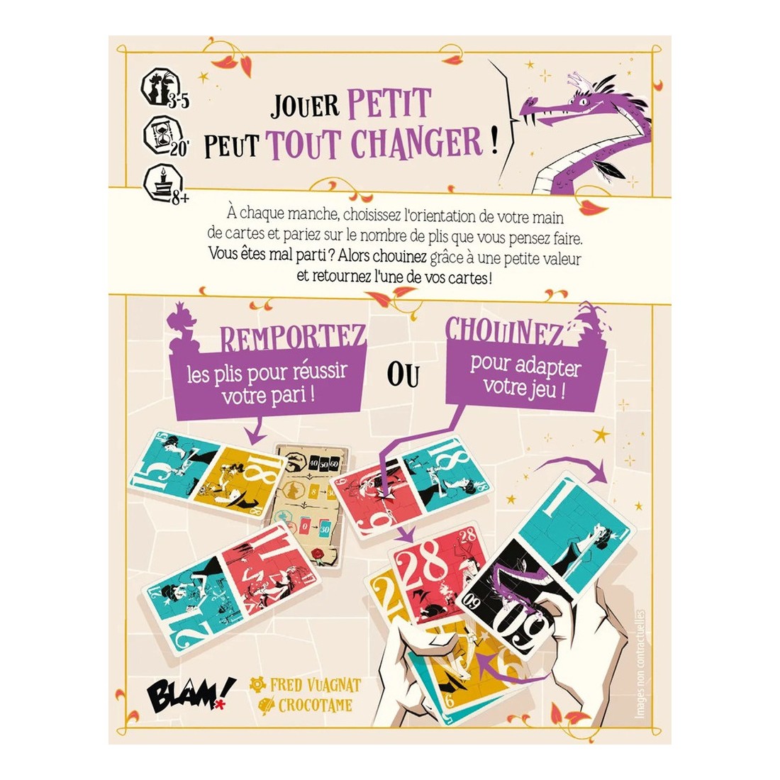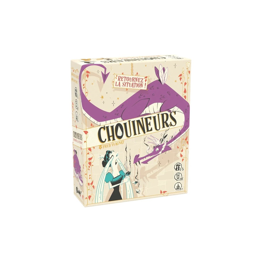 Chouineurs est un jeu de plis. Au début de chacune des quatre manches, vous pariez sur le nombre de plis que vous pensez remporter. Plus vous vous approchez de votre pari, plus vous marquez de points. Mais si les choses ne se déroulent pas comme prévu ? Alors, chouinez un coup ! Et adaptez vous !