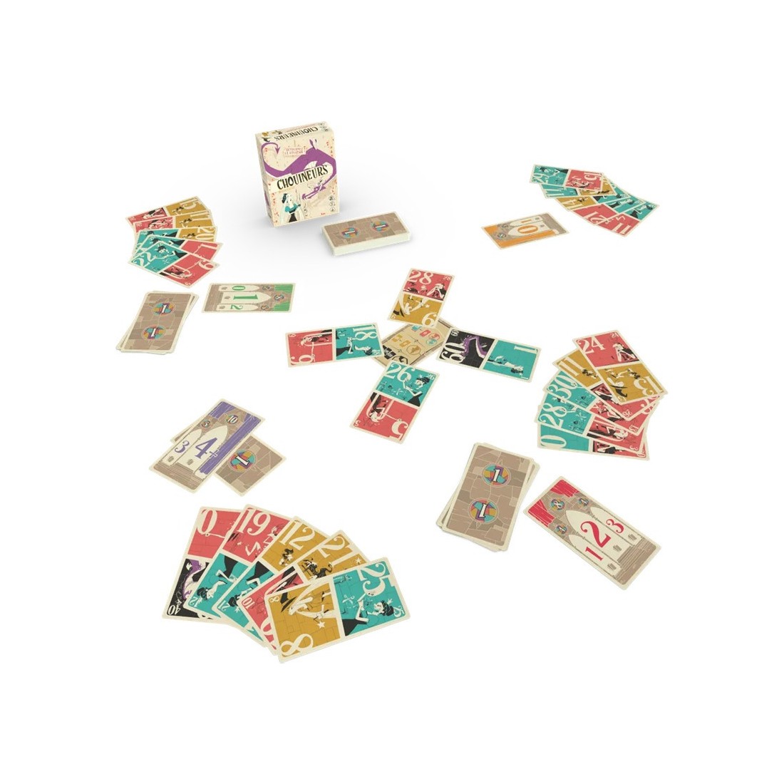 Chouineurs est un jeu de plis. Classiquement, vous devrez "suivre", mais vous pourrez aussi "couper", "pisser", et même "chouiner" ! Au début de chaque manche, vous devez choisir dans quel sens jouer les cartes de votre main. Dépendant de ce choix, vous pariez sur le nombre de plis que vous pensez remporter lors de la manche. Lors d'un pli, la couleur doit être suivie si possible. Sinon vous pouvez "couper", ou "pisser". Vous avez aussi la possibilité de "super-couper", même si vous avez la couleur demandée. Enfin et surtout, si vous jouez la carte de plus petite valeur du pli, vous "chouinez" et pouvez alors gagner un point ou retourner une carte de votre main, et adapter ainsi votre jeu ! Après sept plis, la manche est finie. Chacun gagne des points s'il a réussi son pari ou s'il a "chouiné" durant la manche. Au terme de la quatrième manche, le joueur avec le plus haut score l'emporte.