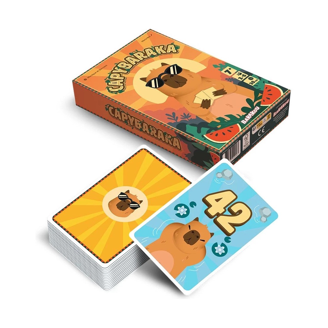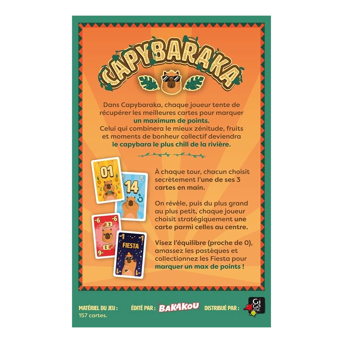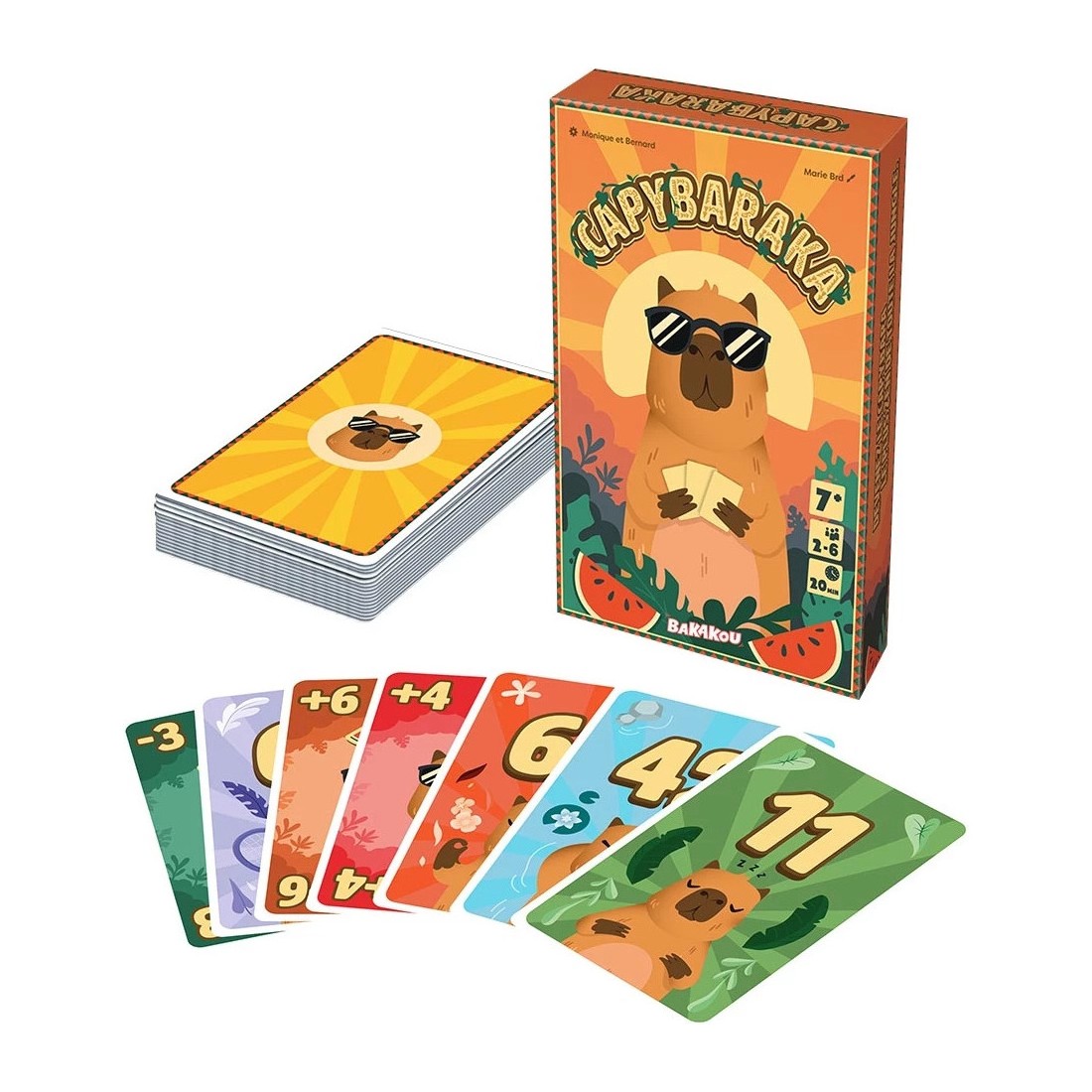 Capybaraka est un jeu de cartes tropical, rapide et délicieusement taquin. À chaque tour, on révèle au centre autant de cartes Zen qu’il y a de joueurs. Chacun choisit secrètement l’une de ses 3 cartes Capybara, on révèle en même temps, puis du plus grand au plus petit numéro, chaque joueur prend une carte au centre.