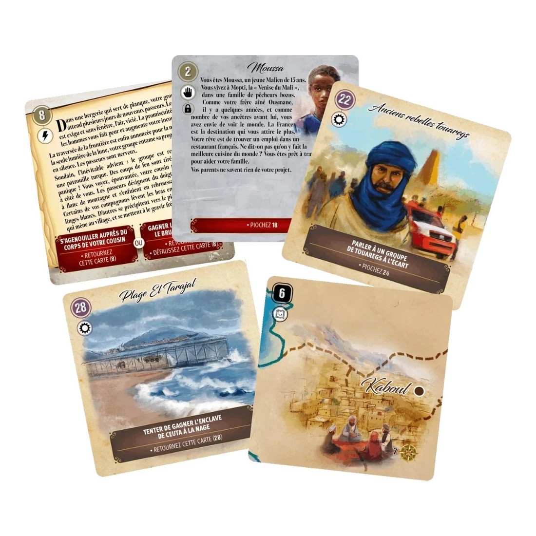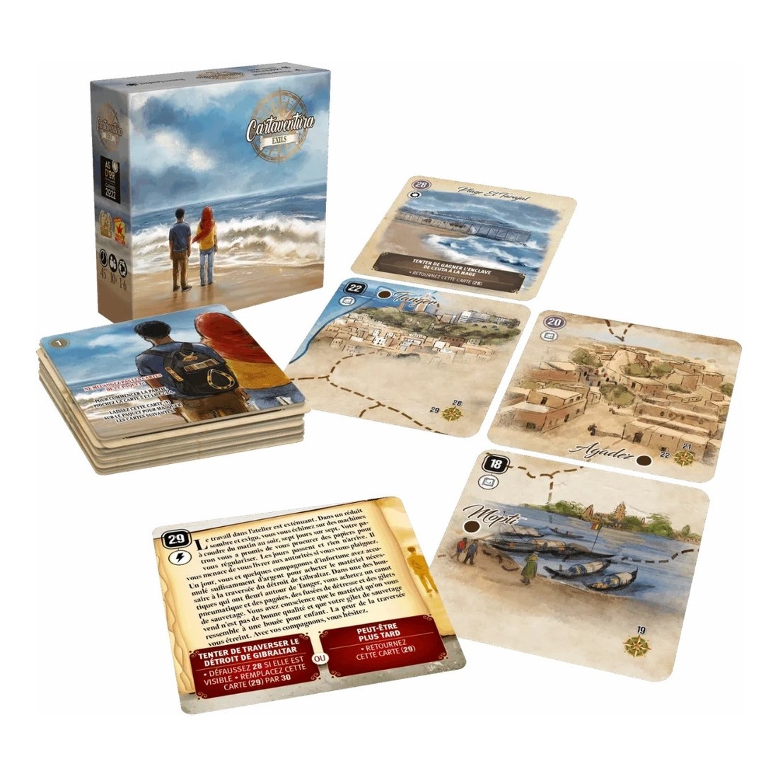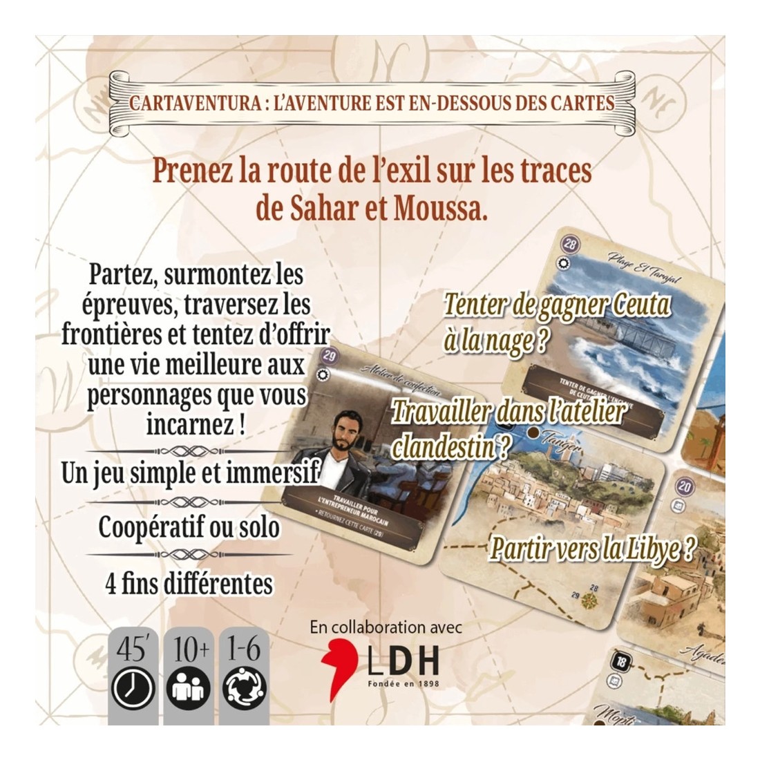 La mécanique de Cartaventura : Exils est très simple à appréhender : révélez des cartes, lisez le contexte, puis choisissez votre action parmi plusieurs options. Ce système favorise l’immersion et incite à rejouer l’aventure afin de découvrir tous les embranchements narratifs possibles. Grâce à ses illustrations soignées et ses deux histoires rédigées en partenariat avec la Ligue des Droits de l’Homme, Cartaventura : Exils vous propose de vivre une aventure une aventure historique forte, immersive et profondément engagée.
