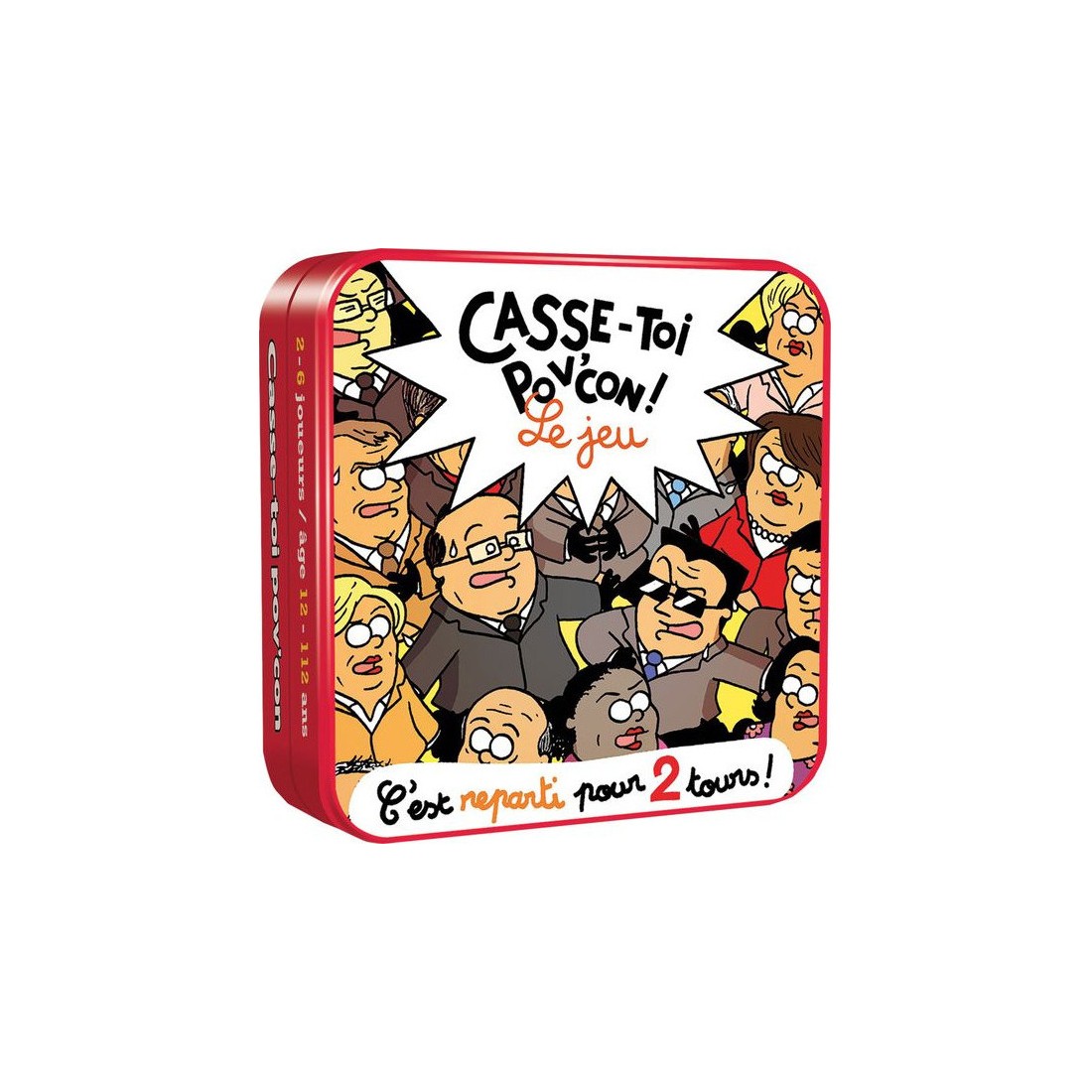 L'essentiel dans Casse Toi Pov' Con n'est pas la stratégie ou la réflexion mais l'ambiance qui régnera autour de la table. Ce jeu présenté en petite boîte métal vous accompagnera chez tous vos amis.. quelles que soient leurs opinions politiques.