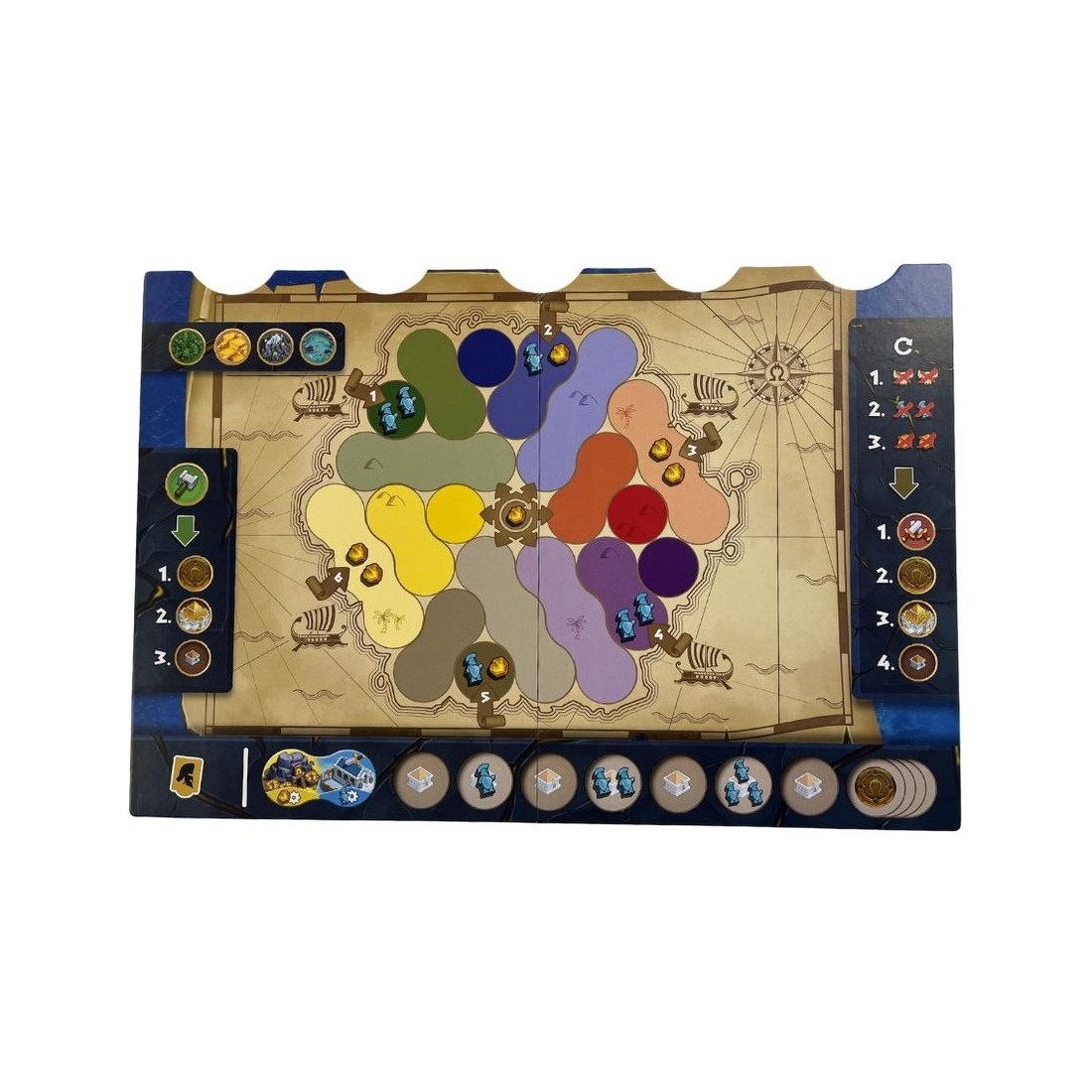 À votre tour, vous choisissez une des cartes Action disponibles. Elle vous donne une tuile Terrain, à poser sur votre plateau pour symboliser l'exploration de l'île. Son positionnement permet aussi de préparer vos futurs constructions et d'attirer l'attention des Titans.Puis vous effectuez l'Action de la carte choisie. Vous pourrez capturer les Créatures peuplant votre île. Recruter des Hoplites sera indispensable pour combattre. Produire de l’Orichalque nécessaire si vous voulez forger des médaillons. Enfin, Construire vous ouvrira la porte de nouvelles stratégies grâce à de puissants Bâtiments.