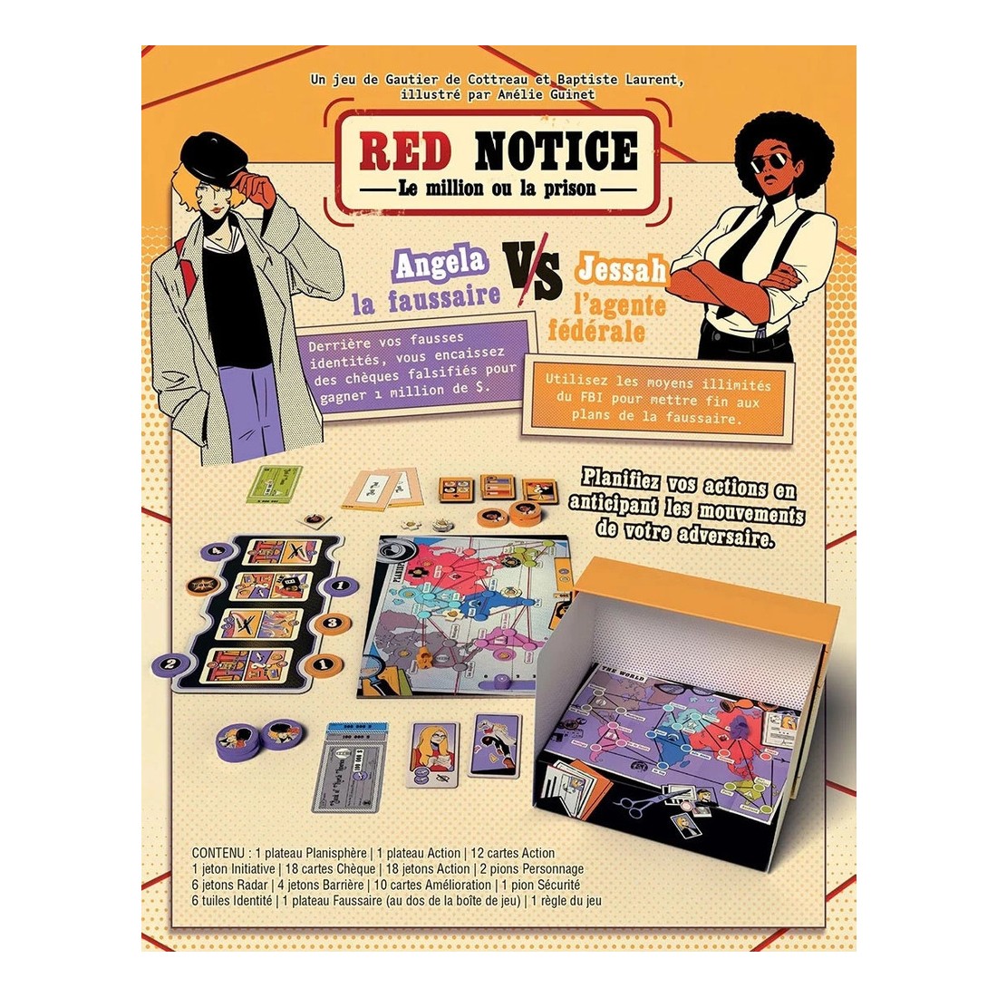 Red Notice - Le million ou la prison est un jeu de société de bluff jouable à 2 joueurs, dès 10 ans pour des parties d'environ 30 minutes, édité par Catch up games.