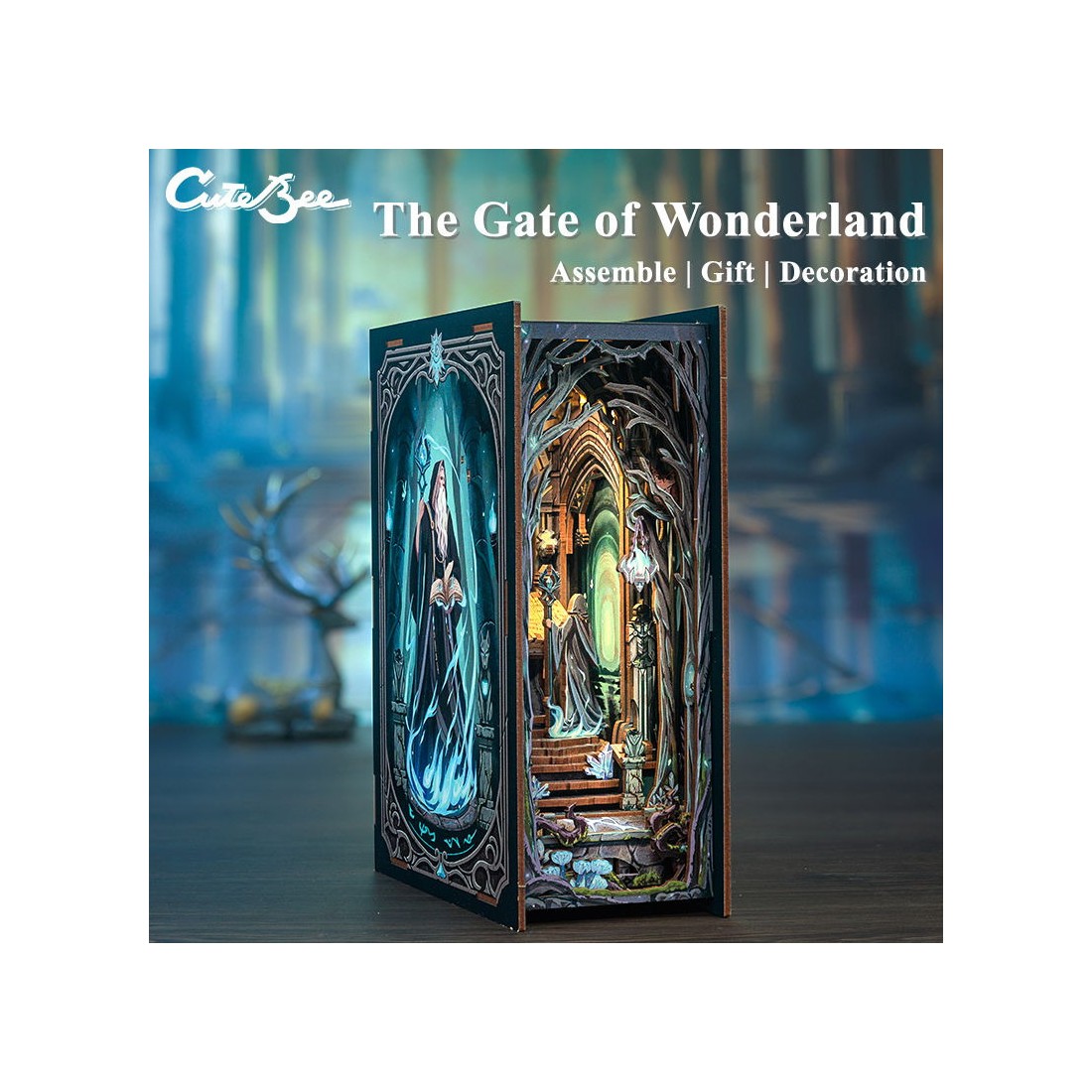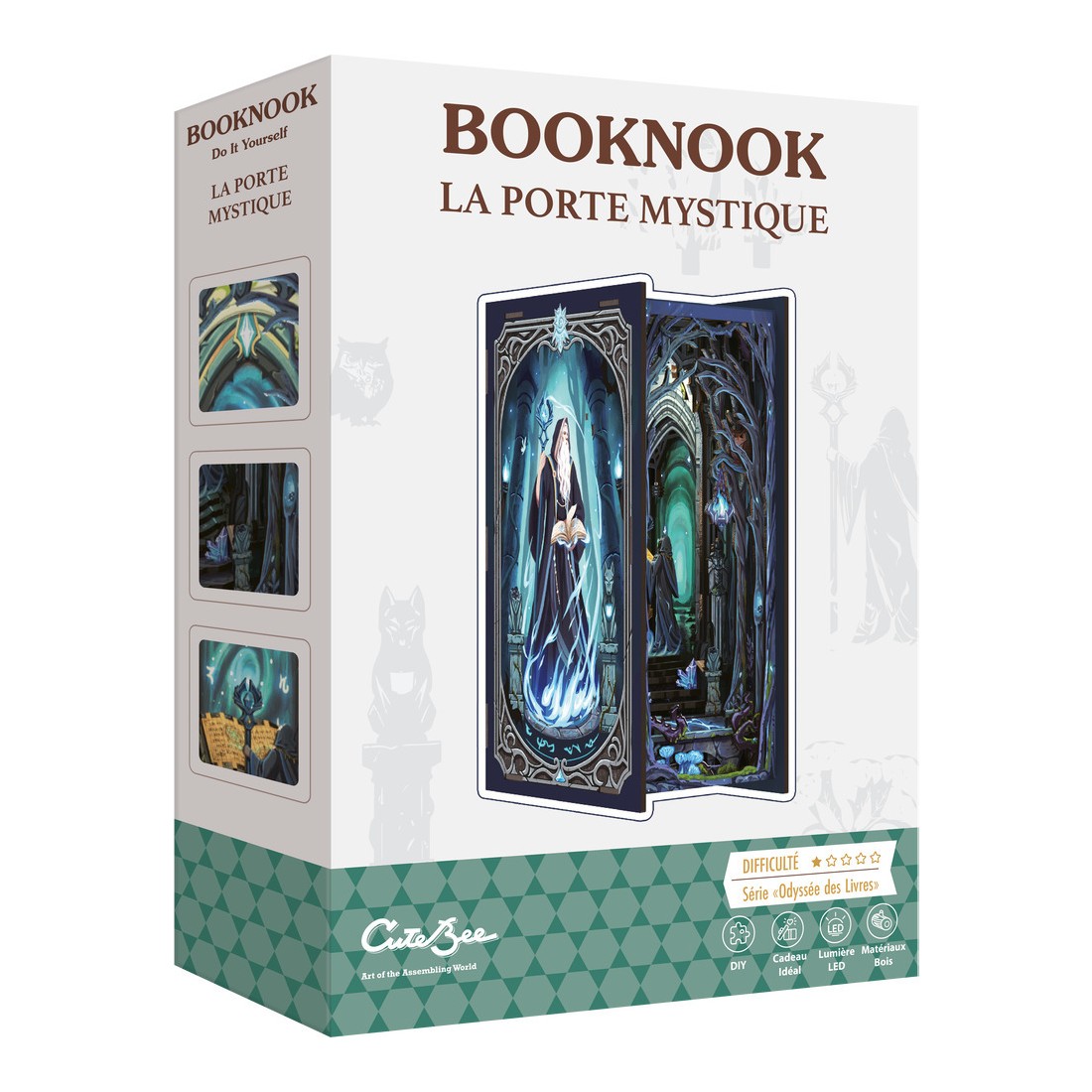 Dans le Booknook – La Porte Mystique, plongez dans une forêt enchantée où une porte magique entourée de pierres mystérieuses vous attend. Un magicien se tient prêt à révéler les secrets d’un monde inconnu, sa cape tourbillonnant dans le vent tandis qu’une lueur mystique émane de la porte.