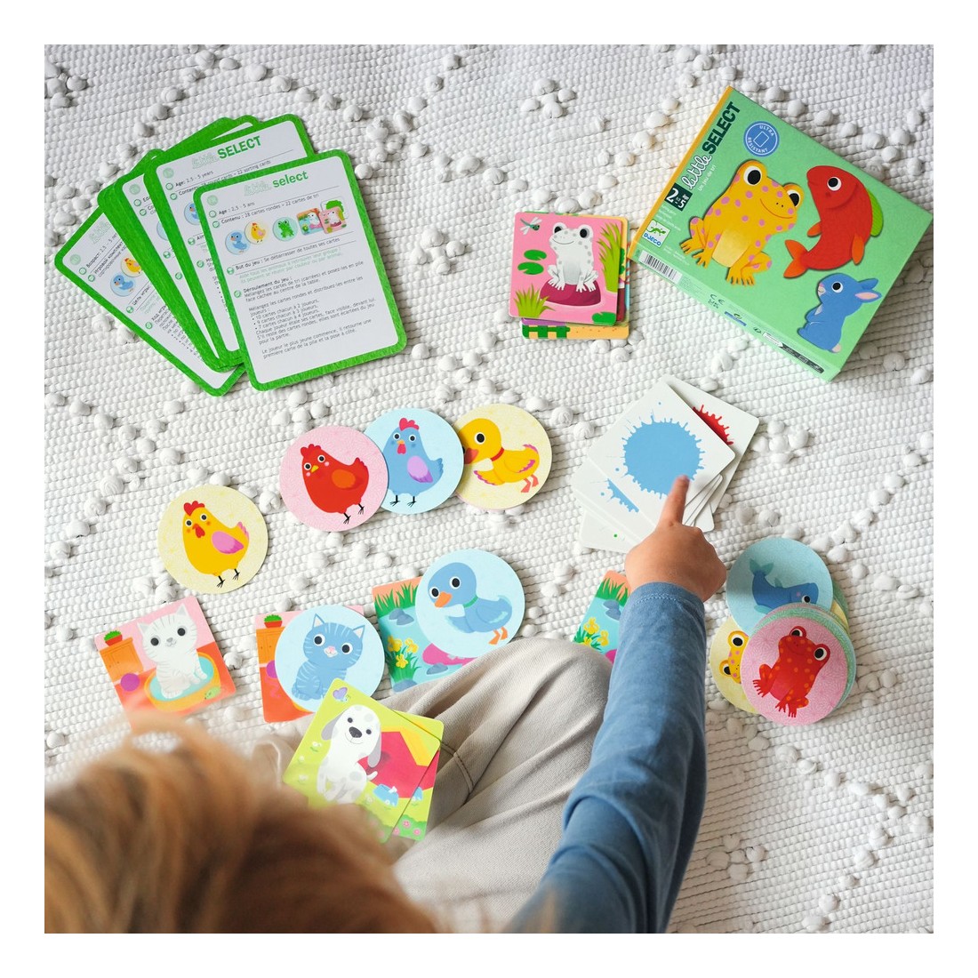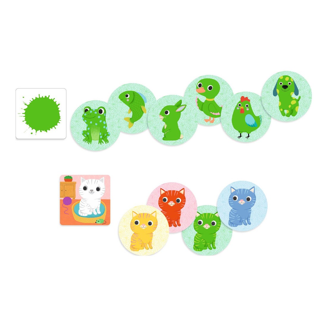 Un jeu de tri. Se débarrasser de ses cartes en suivant la consigne de tri de la carte tirée : couleur / animal. Un premier jeu de tri pour les tout-petits.