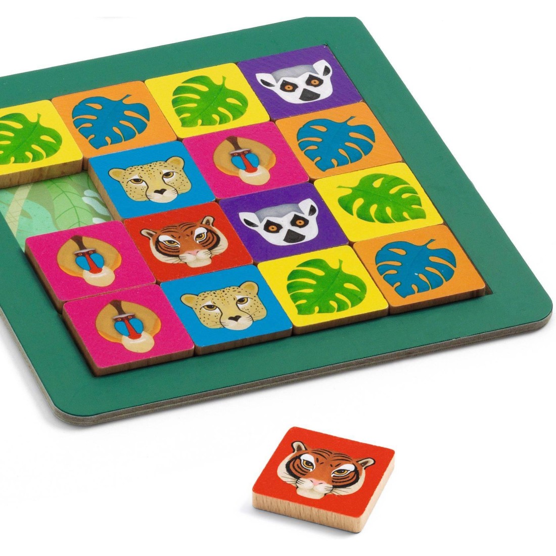 C’est la fête dans la jungle et tous les animaux se sont éparpillés, il faut y remettre de l’ordre !À la manière d’un jeu de taquin, on déplace les tuiles pour réussir à reproduire les indications des cartes défis et gagner le plus de points.
