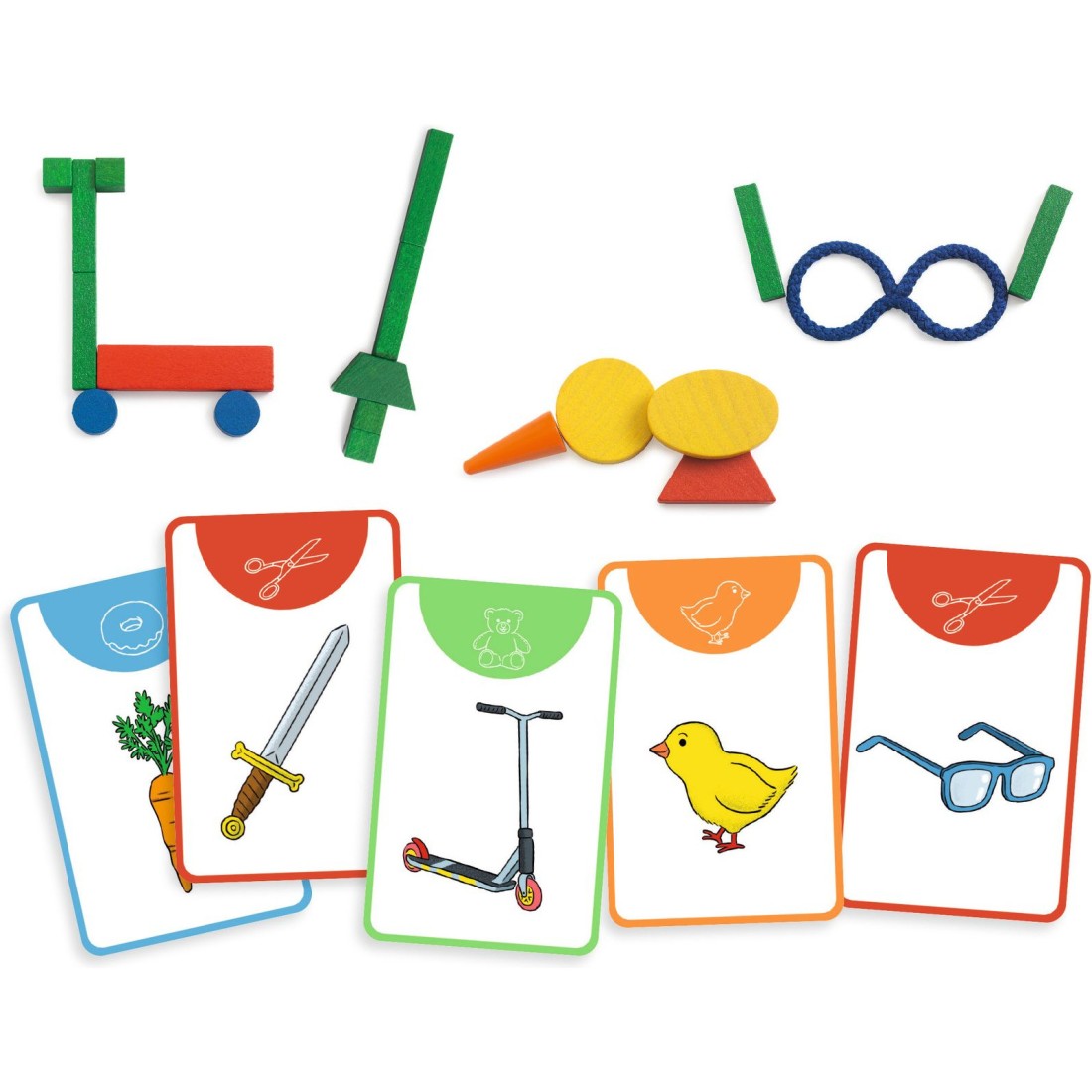 - Un jeu de devinettes créatif, où les joueurs utilisent formes en bois et ficelle pour faire deviner leur carte.