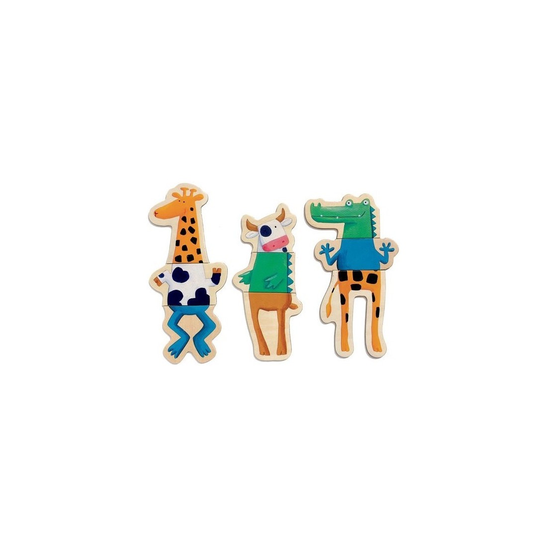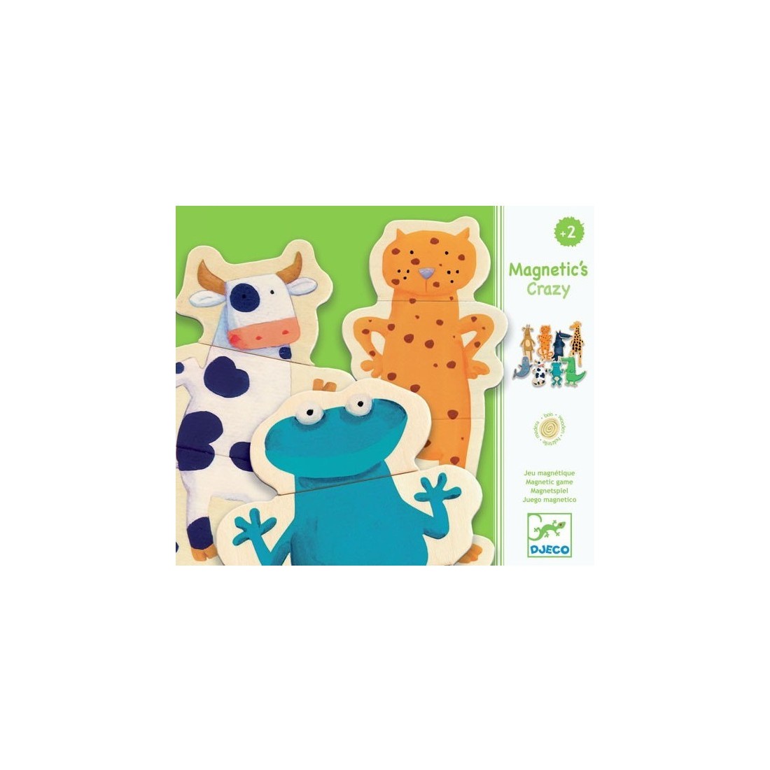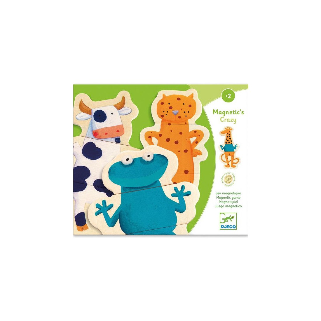 Crazy Animals contient 24 pièces de bois magnétiques qui peuvent être utilisées pour créer 8 nouveaux animaux. Chaque animal se présente sous la forme d'un puzzle en 3 pièces qui correspond à la tête, aux pattes et au corps. L'enfant doit assembler les pièces pour créer les animaux.