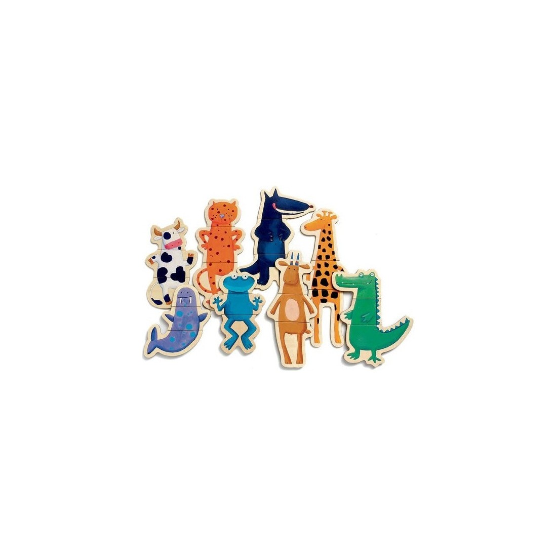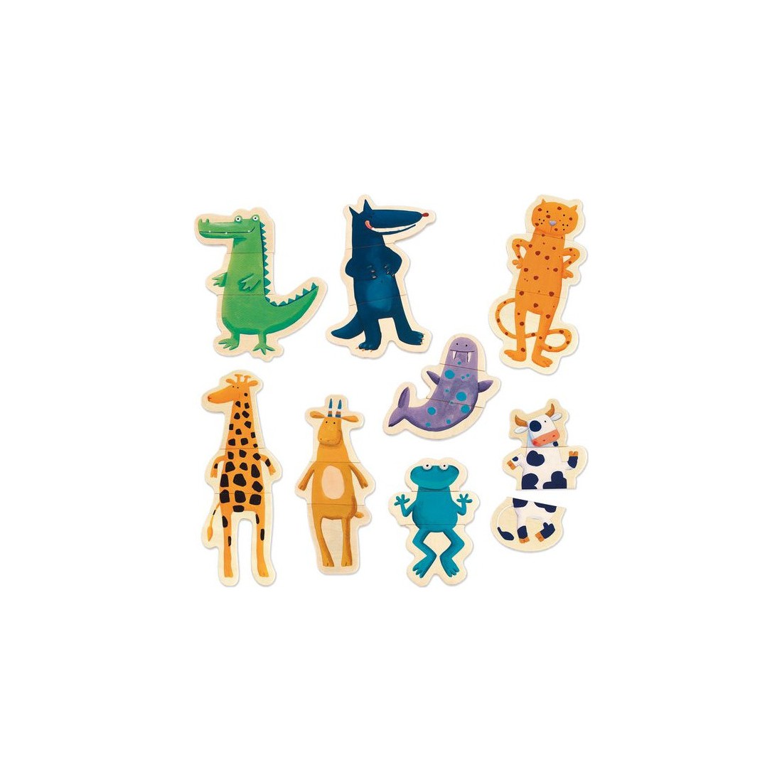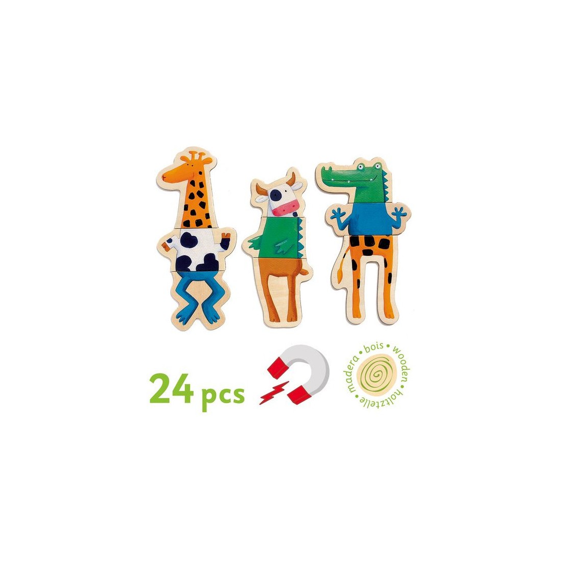 Crazy Animals contient 24 pièces de bois magnétiques qui peuvent être utilisées pour créer 8 nouveaux animaux. Chaque animal se présente sous la forme d'un puzzle en 3 pièces qui correspond à la tête, aux pattes et au corps. L'enfant doit assembler les pièces pour créer les animaux.