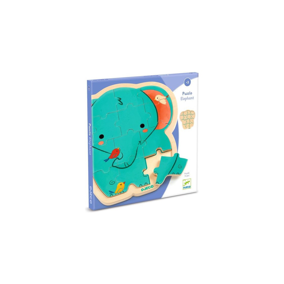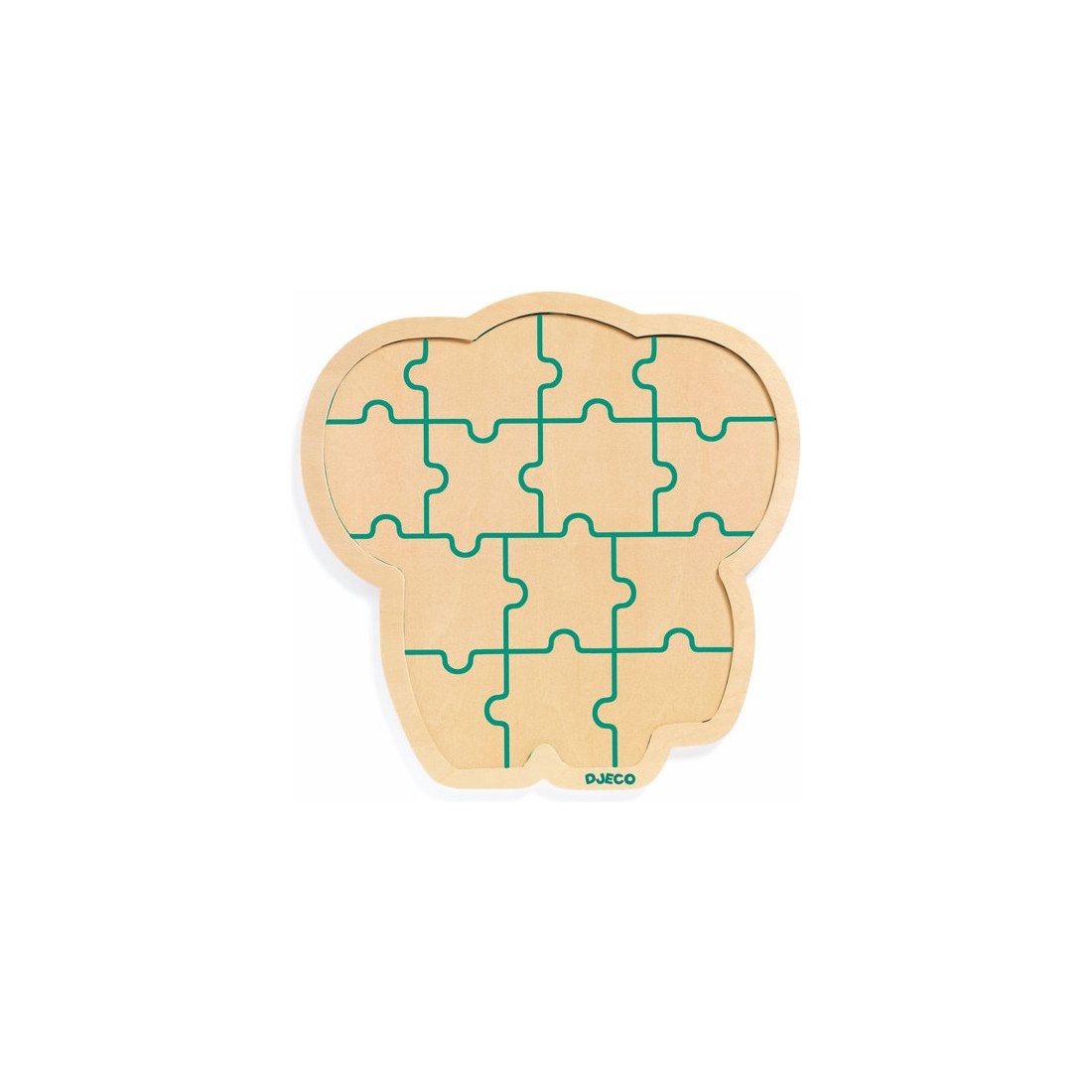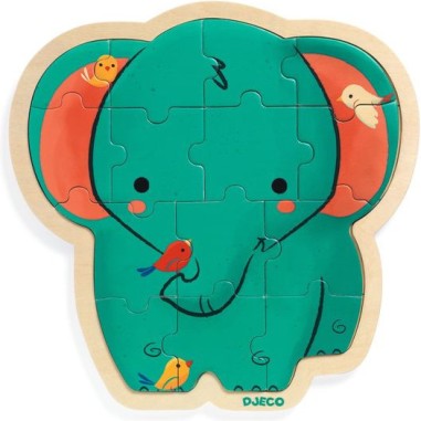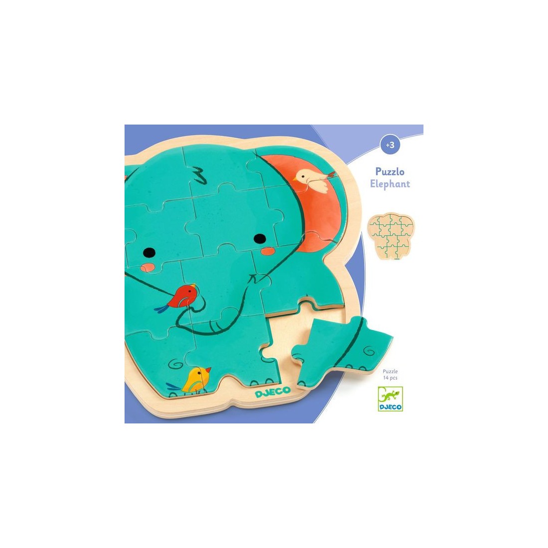 Dans son cadre en bois qui suit la forme de l'animal, l’enfant reconstitue l’image pour y découvrir un joli petit éléphant.