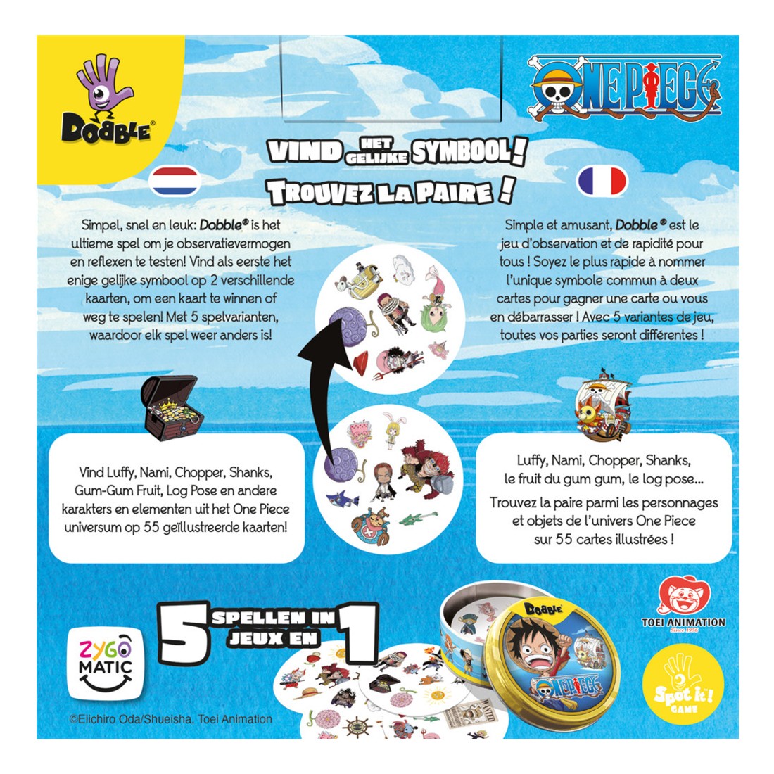 Retrouvez les personnages comme tous les éléments les plus iconiques de l’univers de One Piece: Luffy, Nami, Chopper, Shanks, le log pose, le fruit du Gum-Gum,etc... Dobble est un jeu testant votre rapidité et votre sens de l’observation. Le but est simple : être le premier à trouver le dessin identique entre deux cartes. Cette édition contient plusieurs règles, pour varier les plaisirs.- Référence Asmodée : DOBONP07FRNL