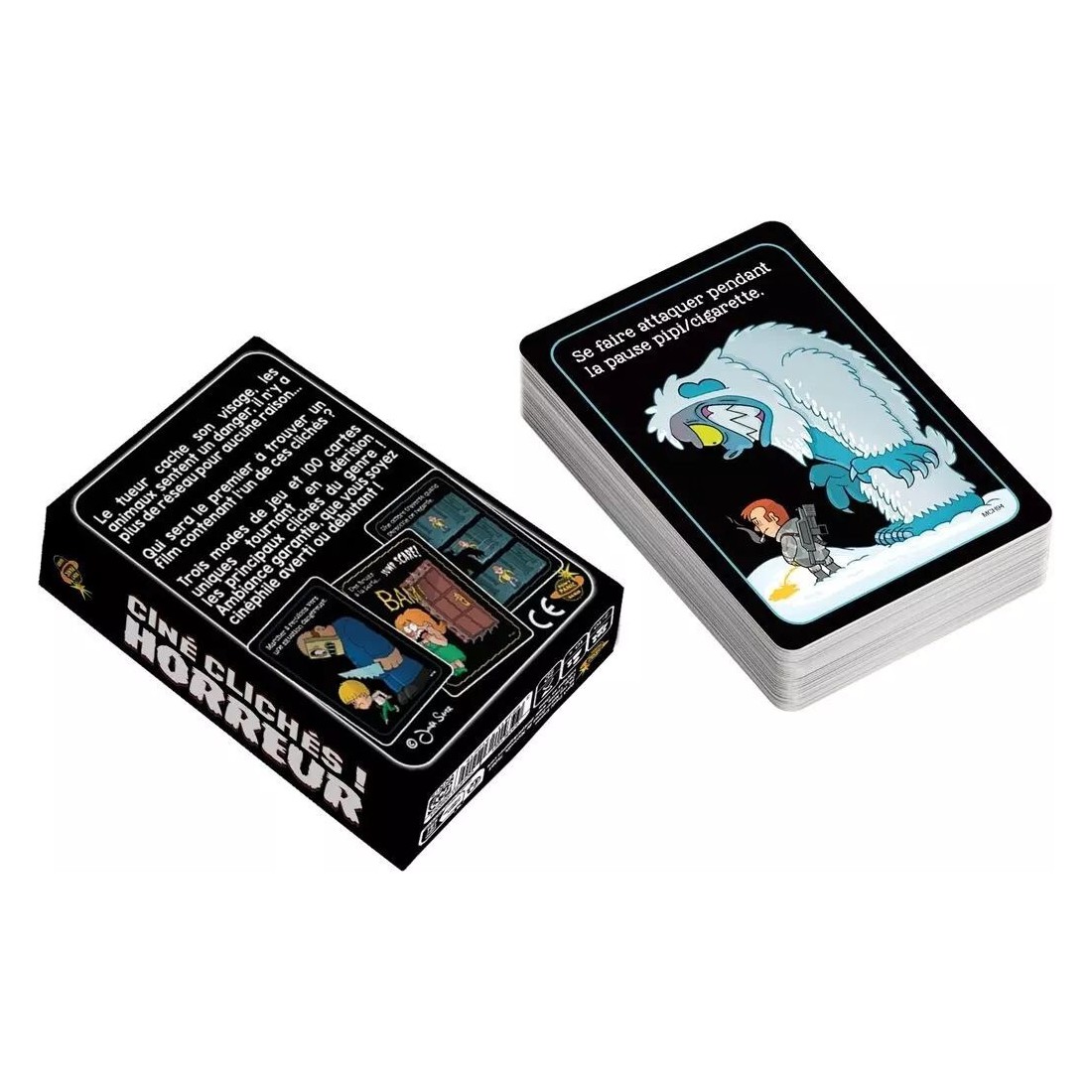 Le tueur cache son visage, les animaux sentent un danger, il n'y a plus de réseau pour aucune raison... Qui sera le premier à trouver un film contenant l’un de ces clichés ? Ciné Clichés ! – Horreur comprend trois modes de jeu et 100 cartes uniques tournant en dérision les principaux clichés du genre !