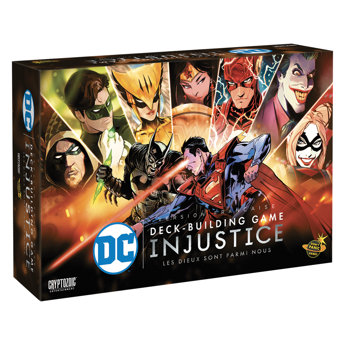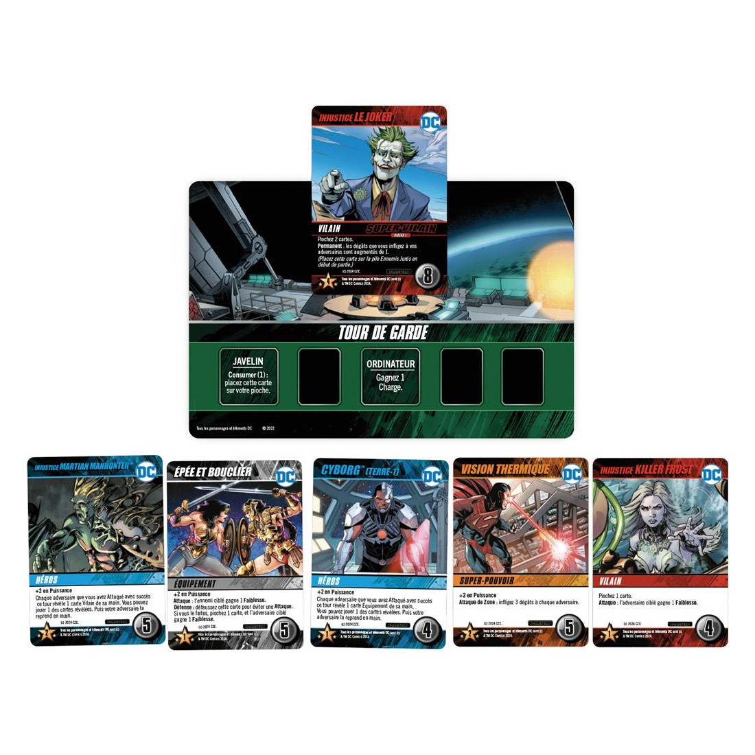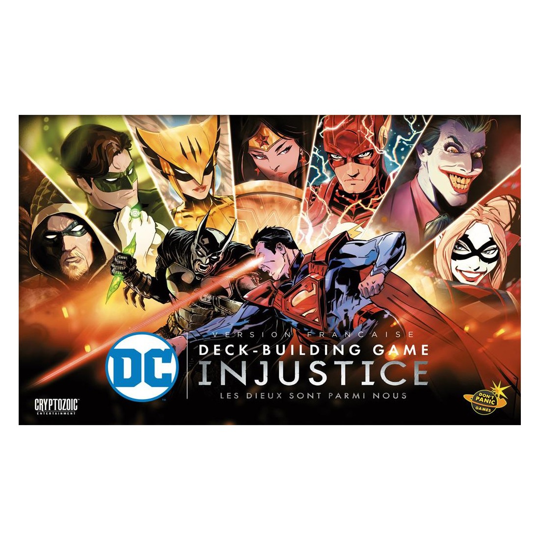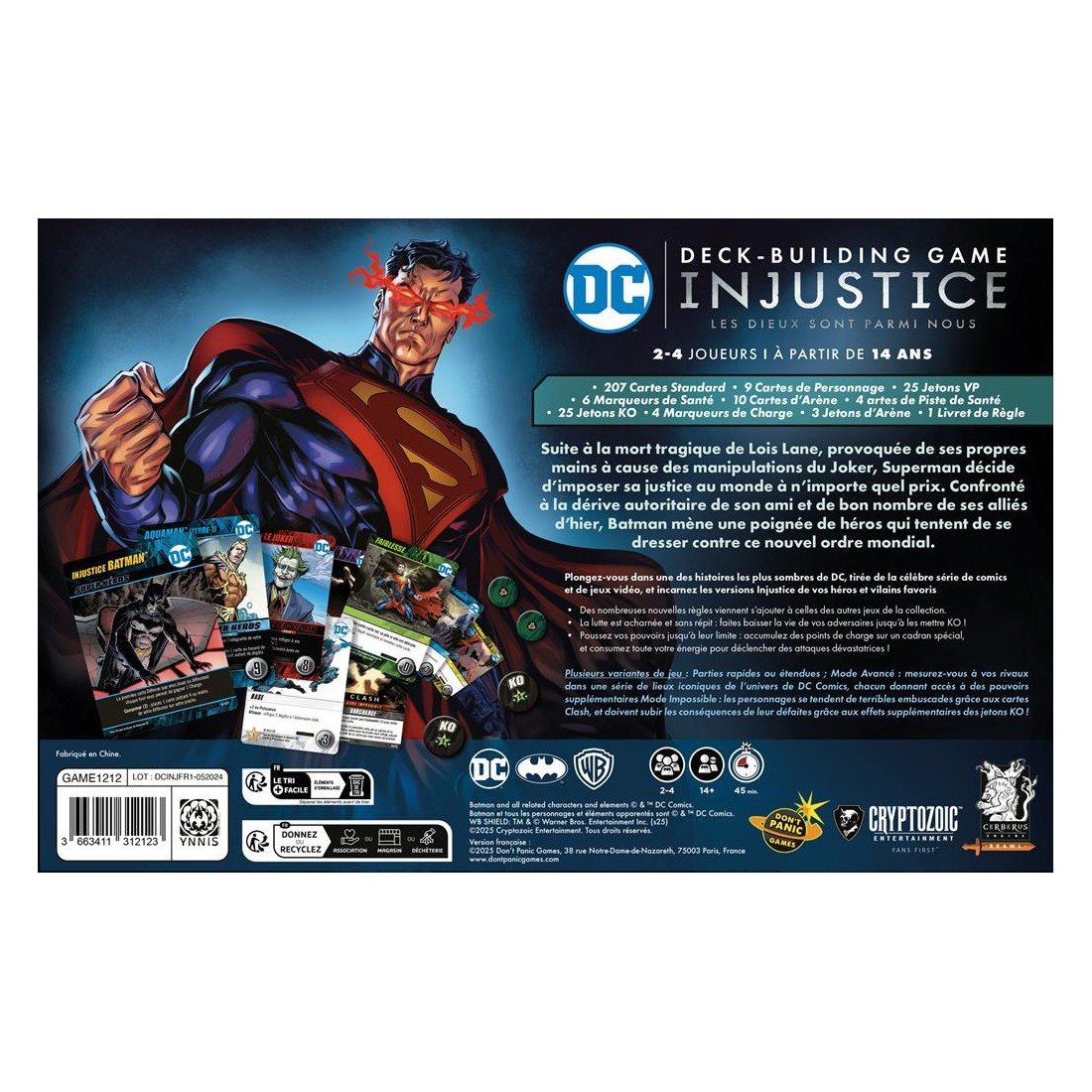 Illustration de couverture par Well-Bee (Marvels X) et cartes de jeu comportant à la fois des illustrations originales et des illustrations tirées directement des bandes dessinées Injustice.