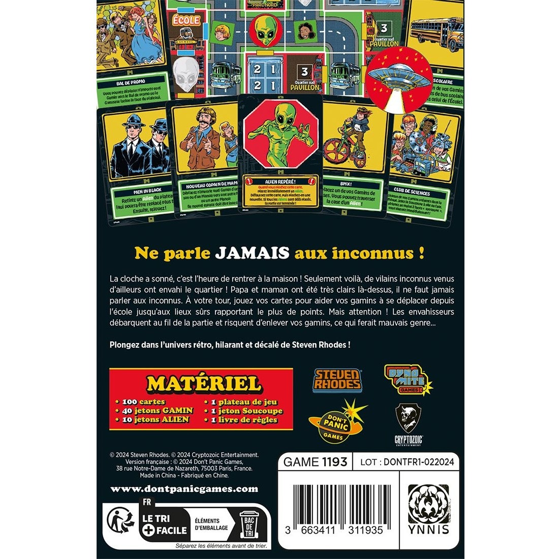 Dans le jeu Don't Talk to Strangers, à votre tour, jouez vos cartes pour aider vos gamins à se déplacer depuis l'école jusqu'aux lieux sûrs rapportant le plus de points. Mais attention! Les envahisseurs débarquent au fil de la partie et risquent d'enlever vos gamins, ce qui ferait mauvais genre...