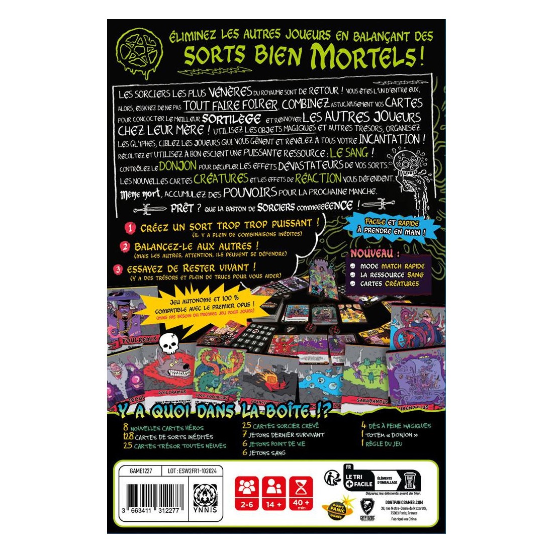 Posez vos cartes faces cachées pour créer un sort, puis quand tout le monde révèle ses choix, appliquez les effets, et préparez-vous à de multiples surprises. Chaque mage possède une main de 8 cartes au début de chaque manche. Sélectionnez une carte Source, une carte Qualité, et une carte Destination pour créer un sort, qui peut au final compter 1 à 3 cartes. Quand tous les joueurs ont fait leur choix, les cartes sont révélées et les résultats sont appliqués, les petits sorts d’abord (d’une seule carte) jusqu’aux plus meurtriers (3 cartes). Réduisez les points de vie de vos adversaires à zéro pour l’emporter ! Pour vous aider, collectez des points de sang et dépensez-les pour obtenir des effets dévastateurs. Et n’oubliez pas de bien lire le nom du sort que vous allez créer pour ajouter à l’ambiance délirante !Contenu :
