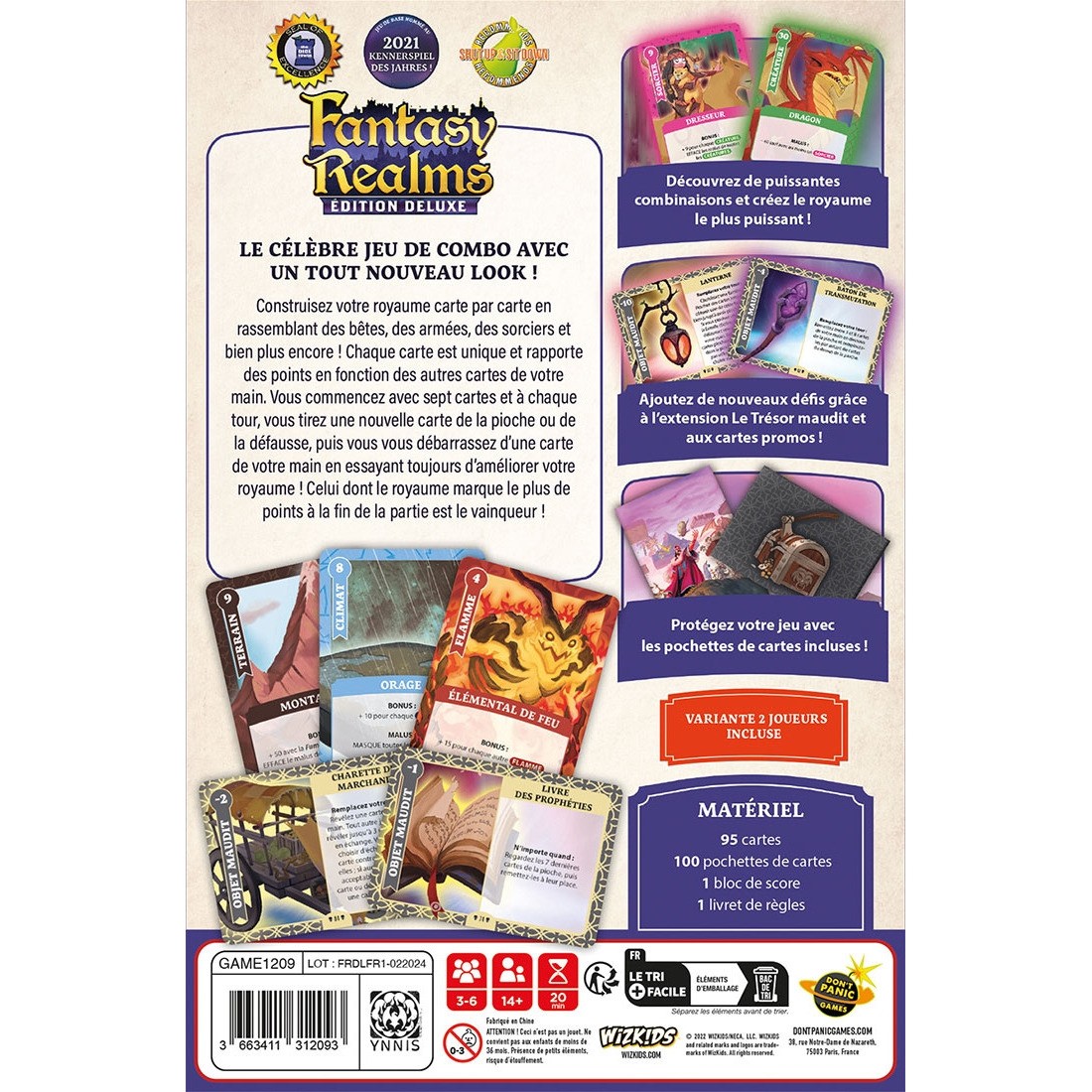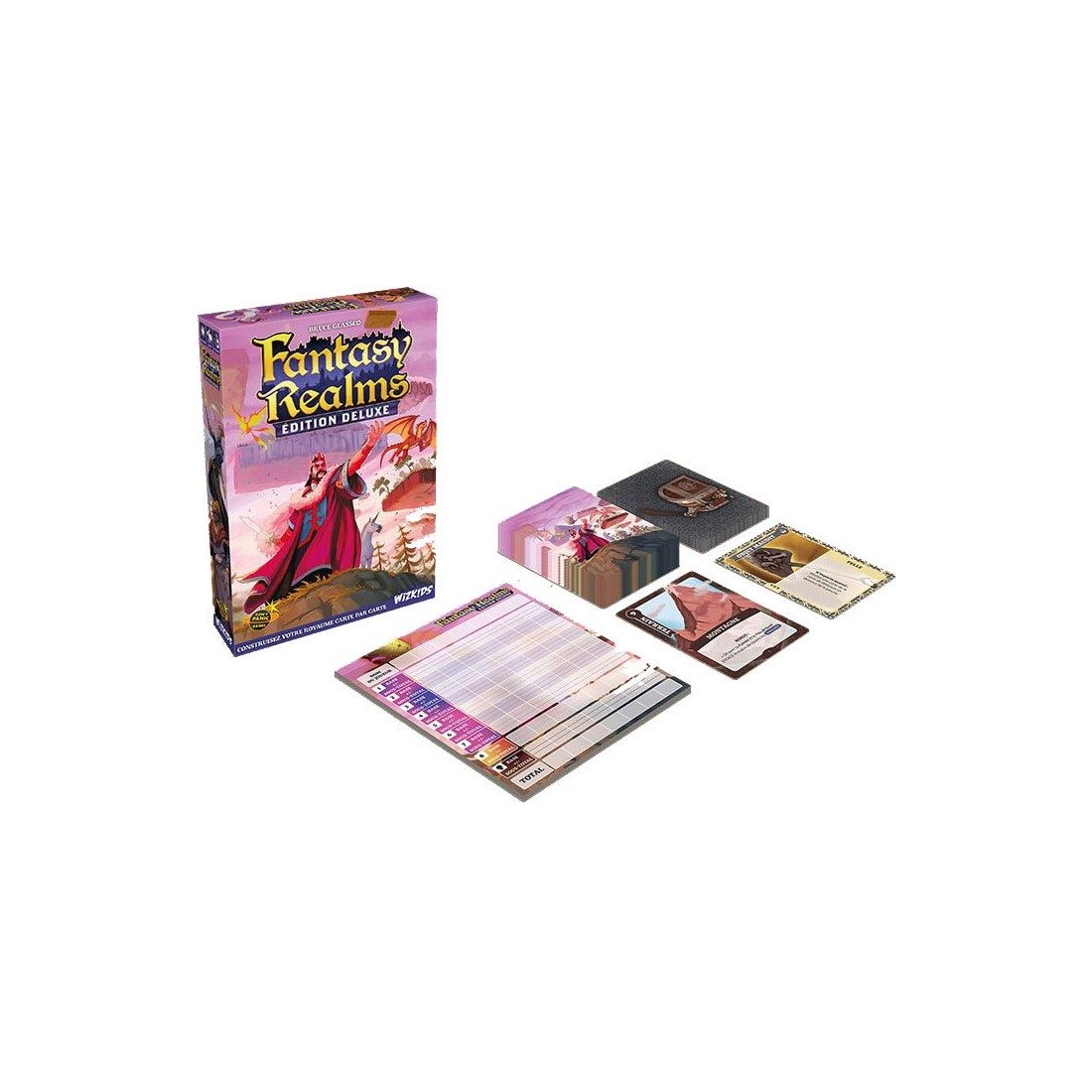 Dans le jeu Fantasy Realms Deluxe, développez votre royaume carte par carte en rassemblant des créatures, des armées, des sorciers et bien plus encore ! Chaque carte est unique et rapporte des points en fonction des autres cartes de votre main. Vous commencez avec sept cartes et à chaque tour, vous tirez une nouvelle carte de la pioche ou de la défausse, puis vous vous débarrassez d'une carte de votre main en essayant toujours d'améliorer votre royaume !