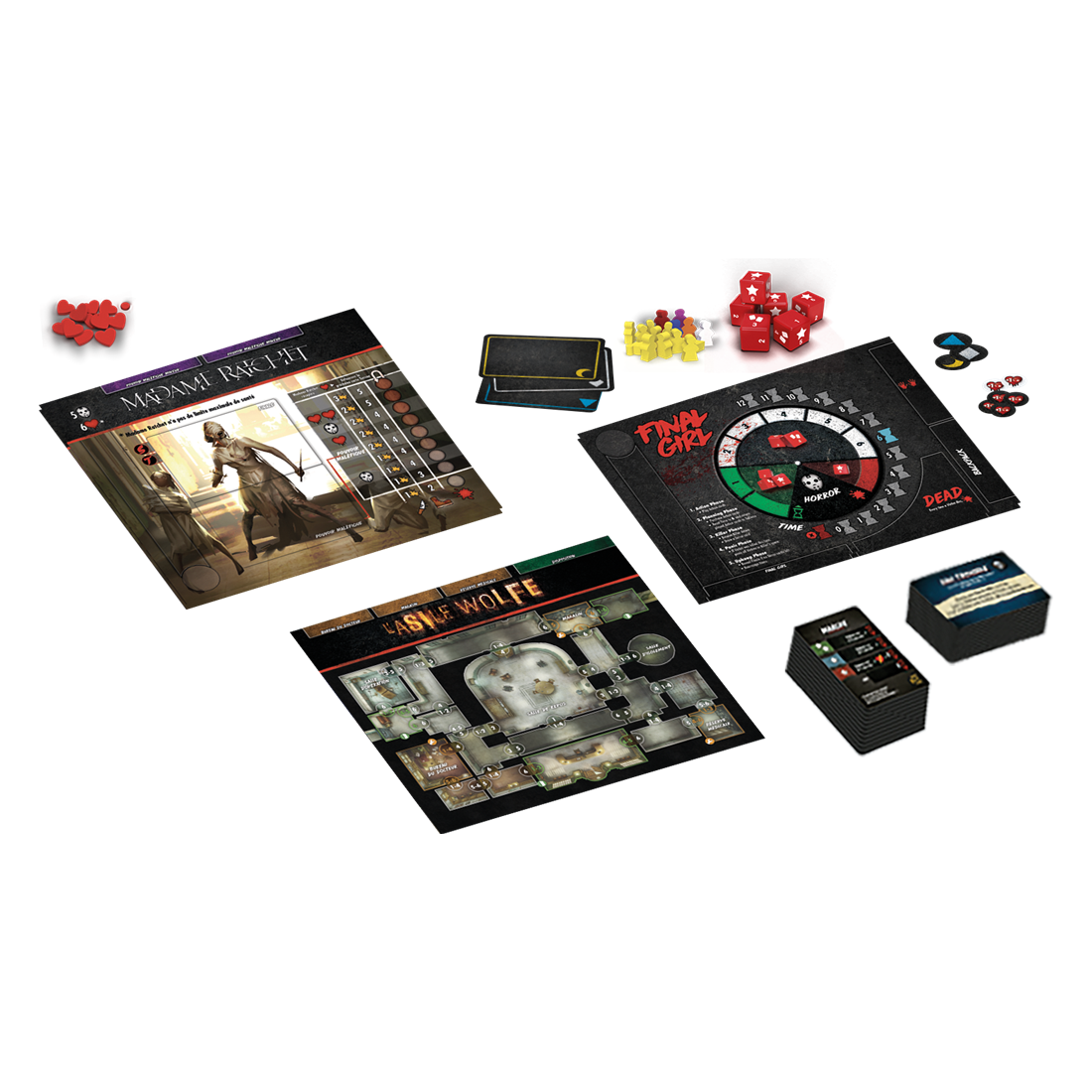 La boîte de base, combinée à l'une des boîtes de films, contient tout ce dont vous avez besoin pour jouer. Chaque boîte de films présente un tueur unique et un lieu emblématique, et plus vous avez de films, plus vous pouvez expérimenter de combinaisons tueur/lieu !Chaque boîte de films est recto-verso, avec des couvertures magnifiquement illustrées au recto Et au verso. De plus, les couvertures aimantées sont amovibles et le verso de chacune d'entre elles sert respectivement de tableau des tueurs et des lieux. Final Girl Saison 2: Hurlements dans les Ténèbres nécessite le jeu de base pour être joué. Contenu :