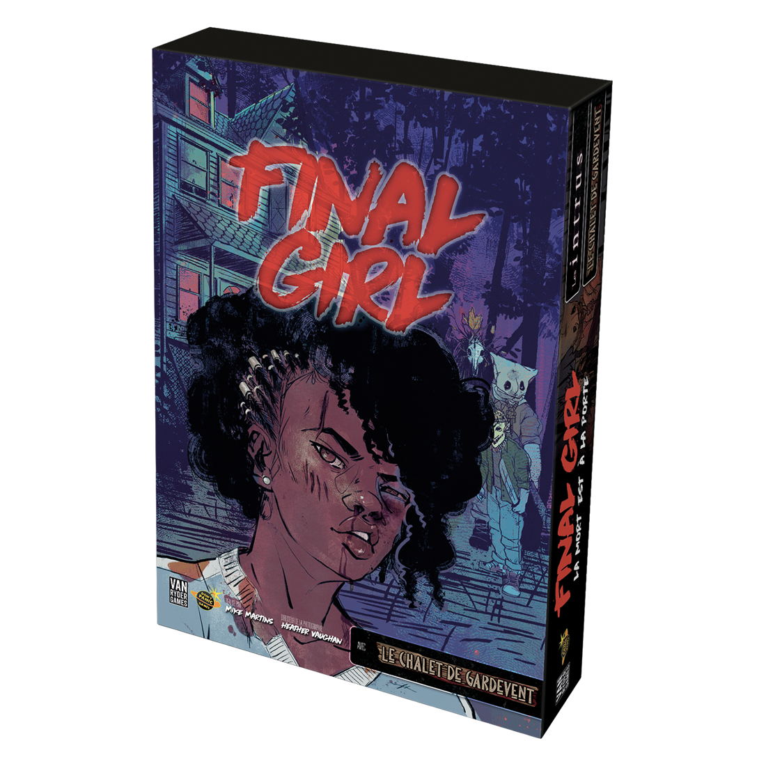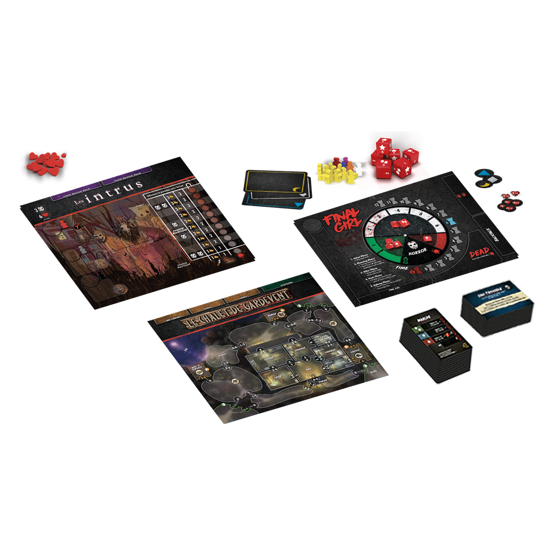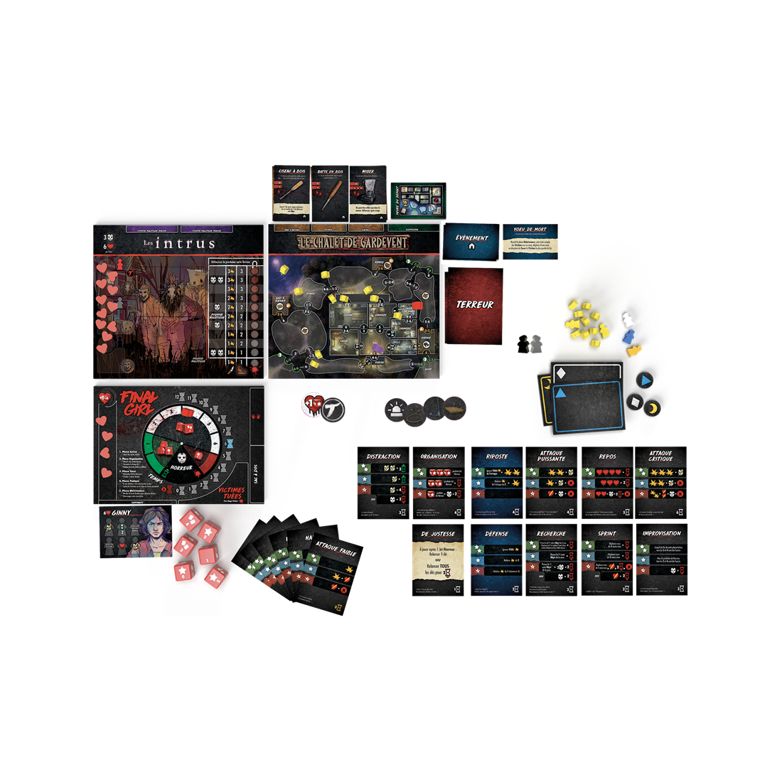 Les intrus veulent pénétrer chez vous ! Cette fois-ci ce n’est pas un, ni deux, mais Trois tueurs qui sont à vos trousses. Il va falloir tout donner si vous voulez survivre. Le Chalet de Gardevent est un nouveau lieu de terreur dans lequel sont cachés des matériaux qui peuvent être transformés en armes impressionnantes grâce à une nouvelle mécanique de fabrication. Allez-vous garder ce simple couteau ou bien obtiendrez-vous du bois et des clous pour fabriquer l’Oblitérateur ? À vous de voir mais le temps presse… ils sont déjà dans la maison ! La boîte de base, combinée à l'une des boîtes de films, contient tout ce dont vous avez besoin pour jouer. Chaque boîte de films présente un tueur unique et un lieu emblématique, et plus vous avez de films, plus vous pouvez expérimenter de combinaisons tueur/lieu !Chaque boîte de films est recto-verso, avec des couvertures magnifiquement illustrées au recto Et au verso. De plus, les couvertures aimantées sont amovibles et le verso de chacune d'entre elles sert respectivement de tableau des tueurs et des lieux. Final Girl Saison 2: La Mort est à la Porte nécessite le jeu de base pour être joué. Contenu :