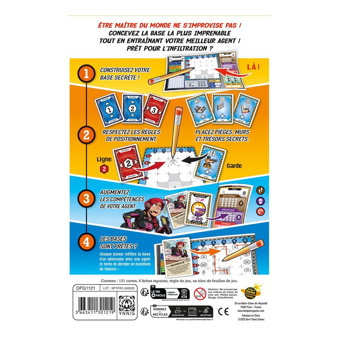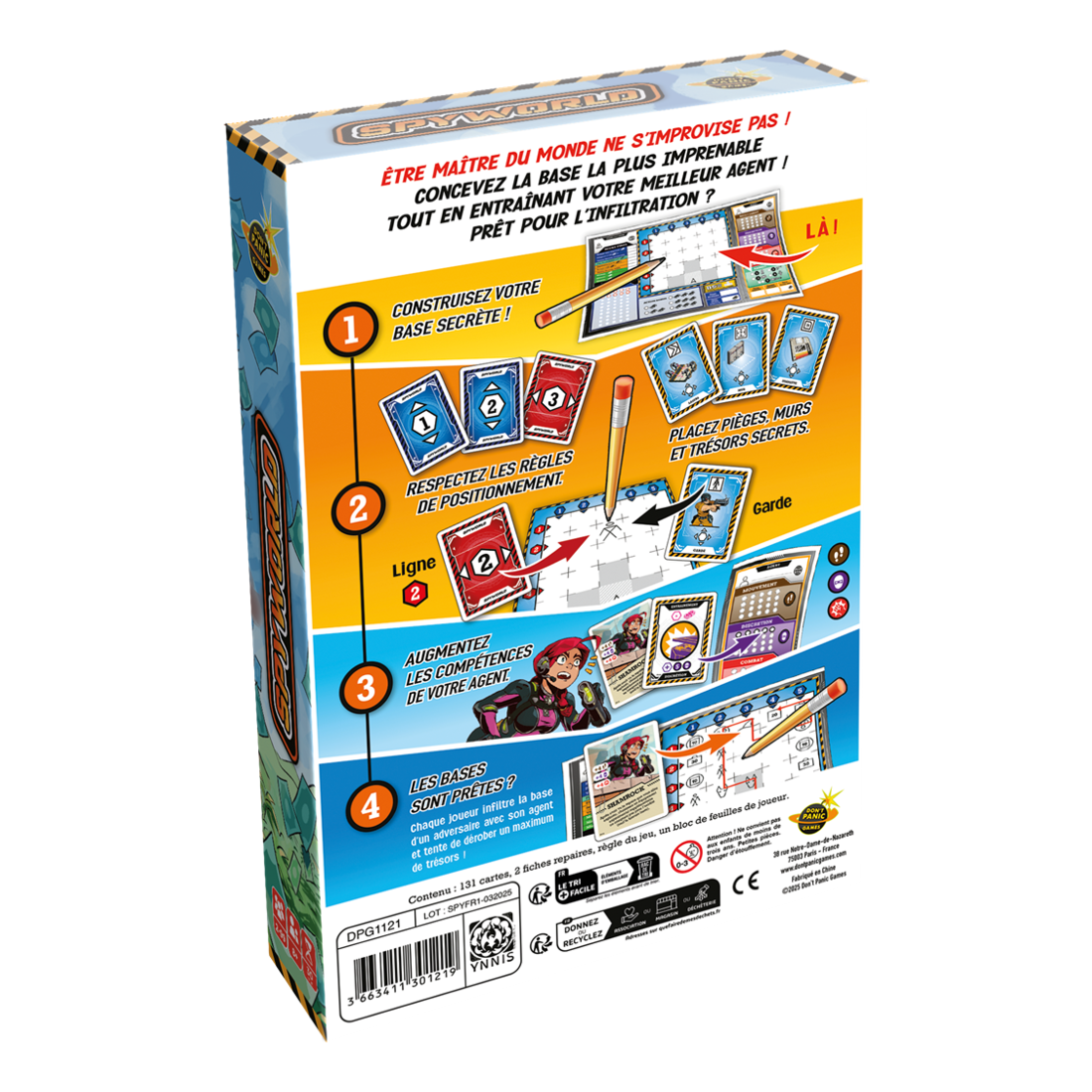 Avec des objectifs secrets, des gadgets uniques et plusieurs plateaux de difficulté croissante, Spyworld vous promet des heures de jeu. Sa mécanique stratégique en deux temps — construction puis infiltration — vous garantit des parties pleines de surprises ! Contenu :4 fiches repaire, 131 cartes, 1 bloc de feuilles de joueur, 1 livret de règles.