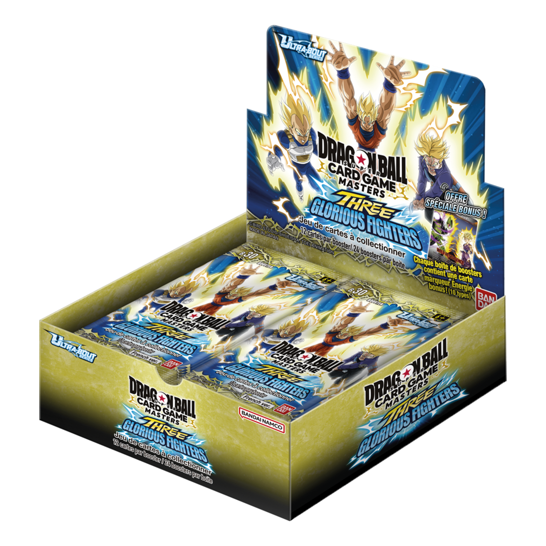 Dragon Ball Super Card Game Masters revient avec une nouvelle série (Ultra-Bout) qui présente de toutes nouvelles expériences en construction de deck et en jeu. Cette série introduit une toute nouvelle couleur : le blanc, pour enrichir et renouveller vos tactiques. Ce premier set baptisé "Un nouveau chapitre" vous permet de découvrir les surprises que vous réserve cette nouvelle série. Vous pourrez retrouver désormais tous les personnages de Dragon Ball Daima avec de nombreuses nouvelles cartes de Combat. Dans ce set, Son Goku (Mini)] et Dr. Arinsu obtiennent des cartes Leader ! Les taux d'obtention des cartes foil ont été améliorés : désormais 4 par booster au lieu de 2. Toutes les cartes de rareté supérieure à Sr auront une finition Silver Foil texturée, un aspect luxueux pour ravir les collectionneurs. Une nouvelle rareté fait aussi son apparition : Concept rare. Les cartes Concept Rare de ce set rendront hommage aux affrontements célèbres de Goku. Le set contient 2 cartes God Rare différentes : une avec un nouveau texte, et l’autre qui présente une nouvelle illustration d’une carte Scr populaire d’une série passée. Enfin, un marqueur énergie en édition limitée est inclus en tant que bonus de chaque boite de boosters ! Chaque booster contient 12 Cartes en français. Un starter deck est nécessaire pour commencer à combattre. Contenu et rareté du set (177 cartes) : Common x50, Uncommon x40, Rare x34, Super Rare x18, Concept Rare x5, Special Rare x15, Special Leader Rare x10, Secret Rare x3, God Rare x2. Box topper : 1 par boîte, 10 types différents à trouver + 10 version parralèle.