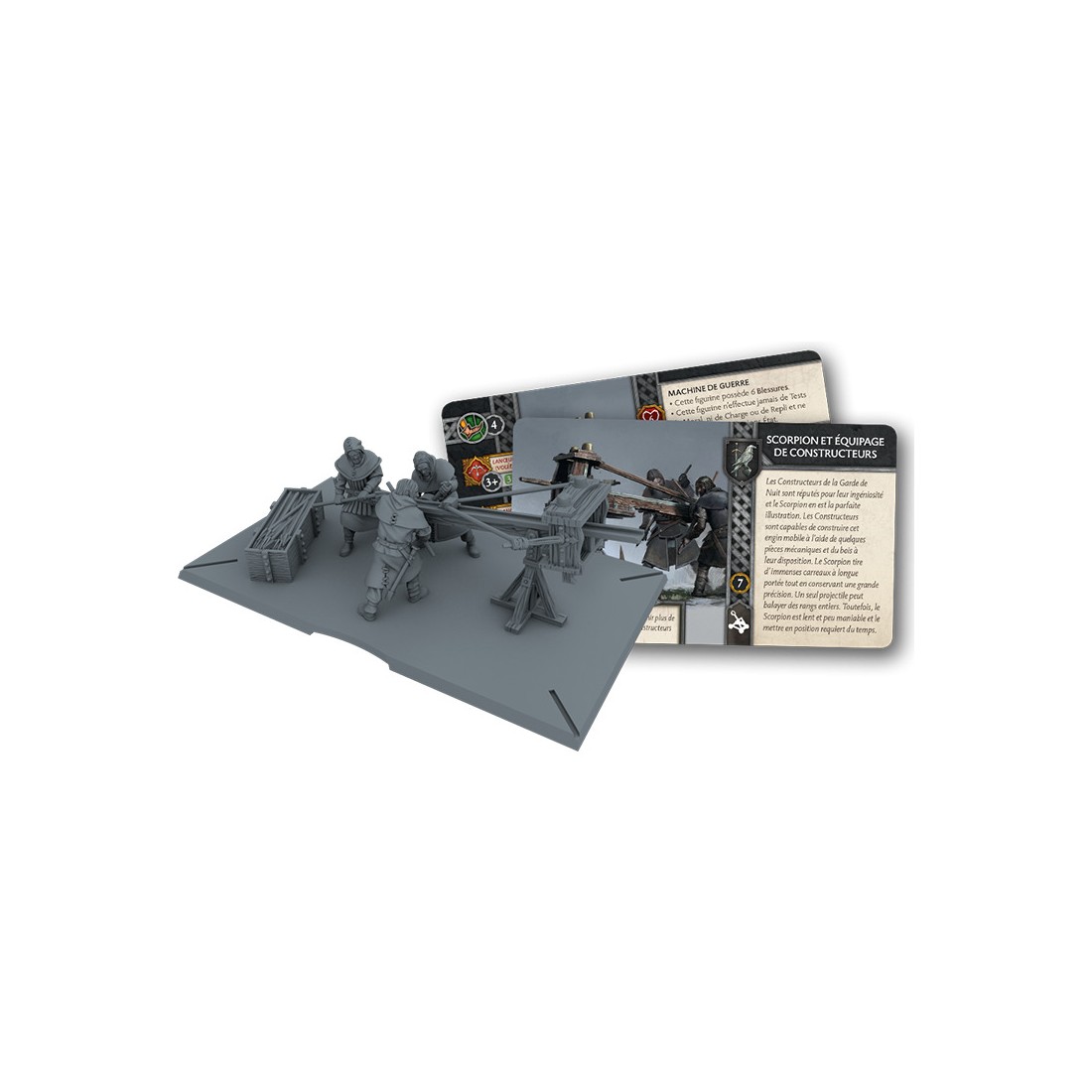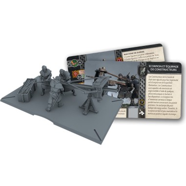 Les Constructeurs ont pour tâche de bâtir et d’assurer la maintenance des imposantes défenses de la Garde de Nuit, engins de siège compris. Bien que le Scorpion ne soit que le petit frère de la gigantesque baliste montée au sommet du Mur, il est toutefois capable de tirer un projectile de taille non négligeable à longue portée tout en conservant une précision mortelle. Il est simple à recharger et peut faucher des rangs entiers de troupes ennemies. En contrepartie, positionner un tel engin sur le champ de bataille n’est pas simple et le Scorpion demeure extrêmement vulnérable face à la cavalerie ou aux tirs.Dans Le Trône de Fer : Le Jeu de Figurines, les batailles épiques, les machinations politiques et les personnages légendaires de la célèbre saga de George R. R. Martin prennent vie sur votre table de jeu. À l’aide de magnifiques figurines pré-assemblées et de plateaux de déplacement, menez les armées et les héros des grandes Maisons de Westeros à la bataille et combattez pour le Trône de Fer au cours de nombreux modes de jeux uniques.