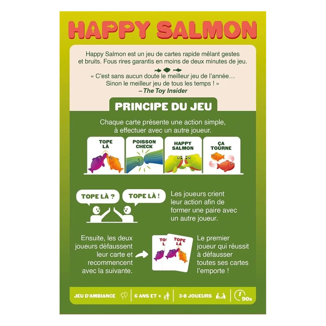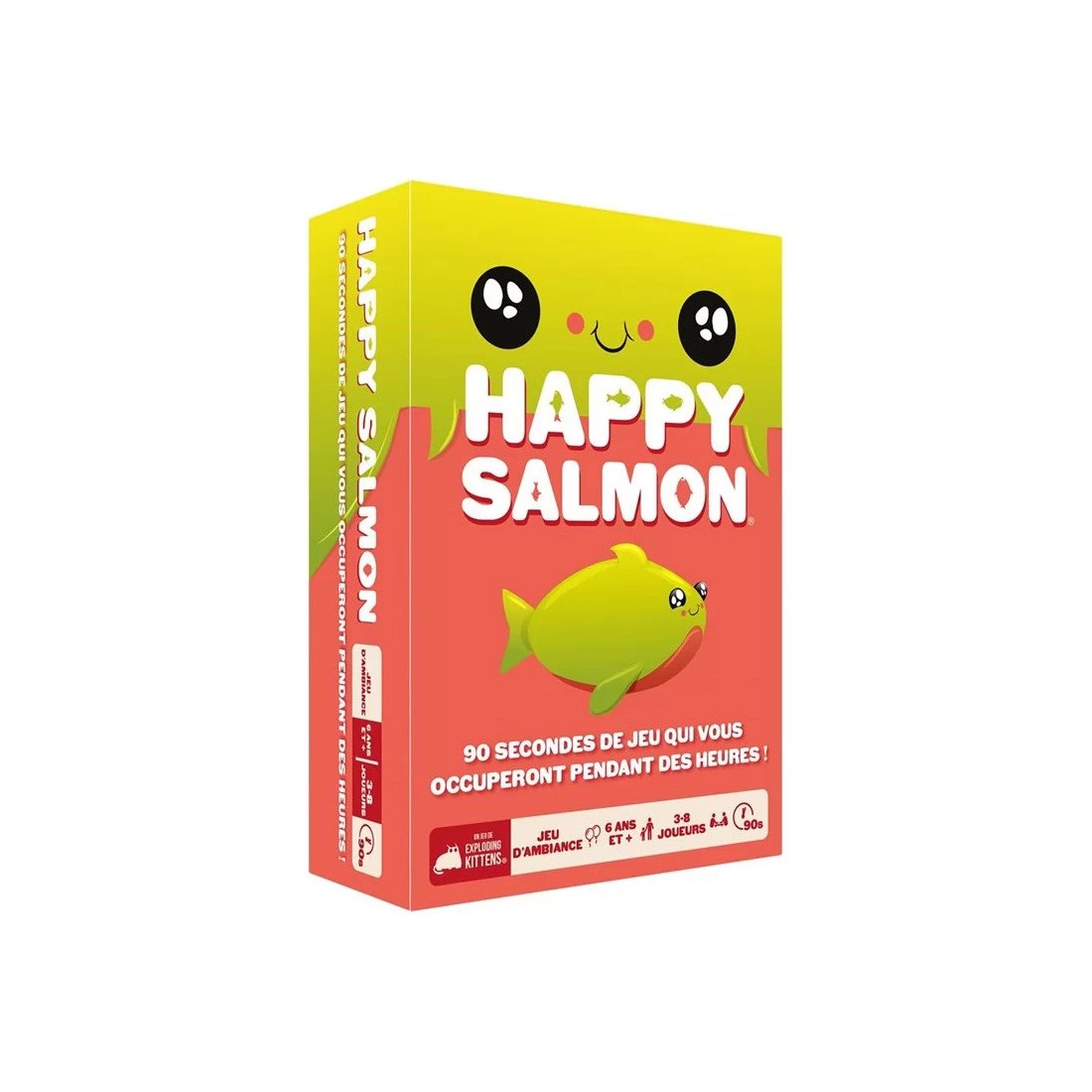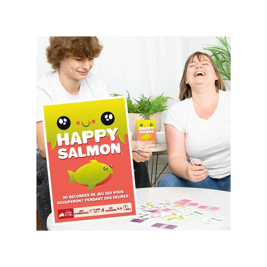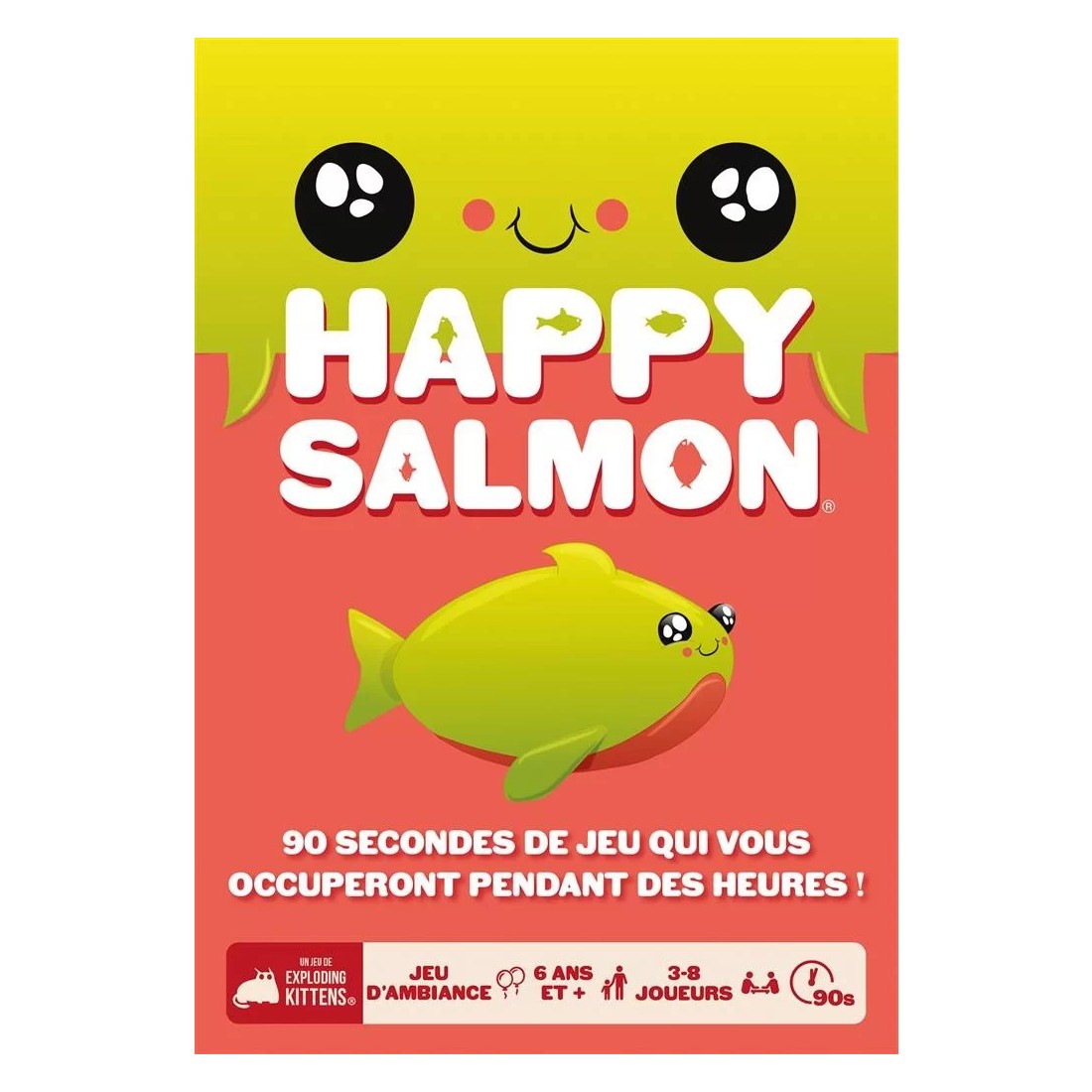 Happy Salmon est un jeu physique, rapide et explosif ! Faites de la place et débarrassez-vous de vos chaises. Le but ? Être le premier joueur à défausser toutes ses cartes. Chaque joueur reçoit un paquet de cartes identiques, à la couleur qu’il a choisie.