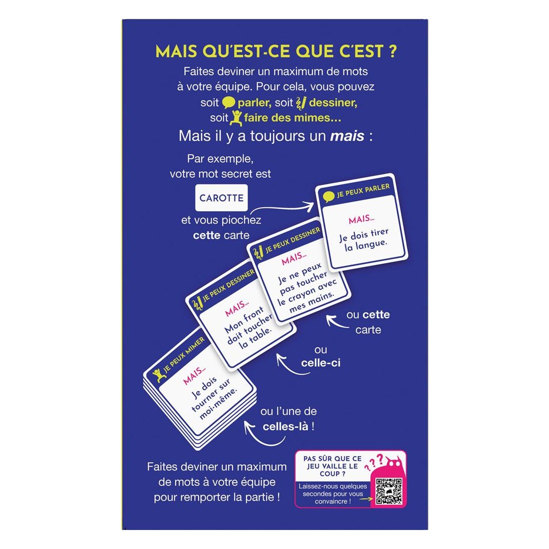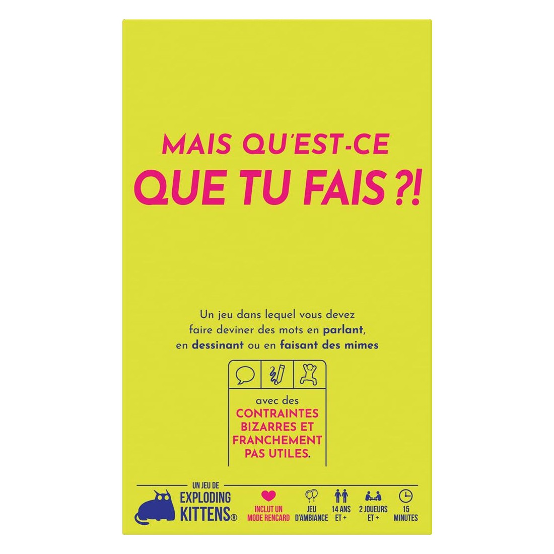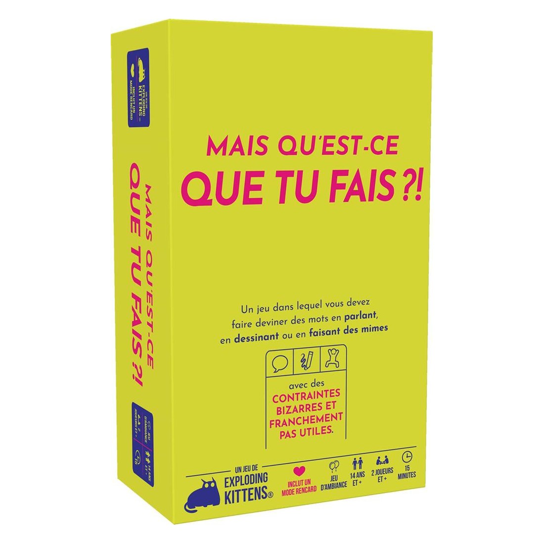 Faites deviner un maximum de mots à votre équipe en mimant, en expliquant ou en dessinant… mais il y a toujours une contrainte saugrenue : coller le front sur la table, utiliser les bras d’un coéquipier, etc. Vous pouvez jouer équipe contre équipe, ou en mode coopératif. Quand c’est votre tour, retournez une carte Défi qui vous indique si vous devez effectivement mimer, dessiner ou expliquer, afin de faire deviner un maximum de mots dans le temps indiqué (30 secondes à 2 minutes).