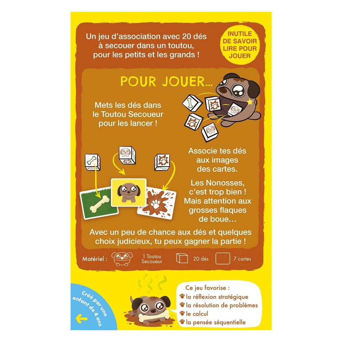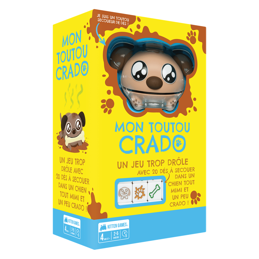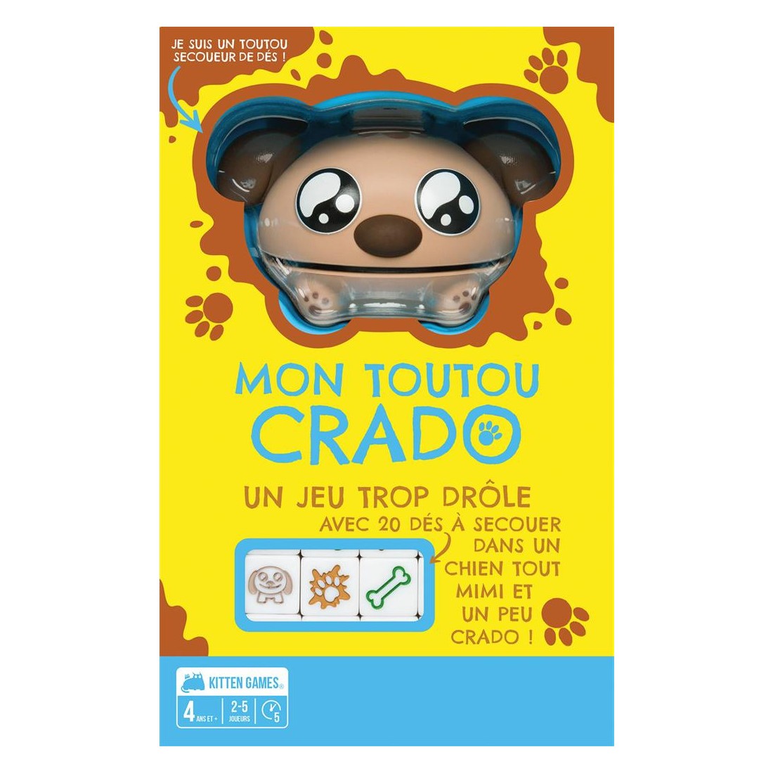 Avec ses règles simples, ses rebondissements et son Doggy Shaker rigolo, Mon Toutou Crado séduira les enfants dès 4 ans,et les plus grands avec son format rapide et ses retournements imprévisibles. Contenu :Un doggy shaker, 20 dés, 7 cartes, 1 livret de règles
