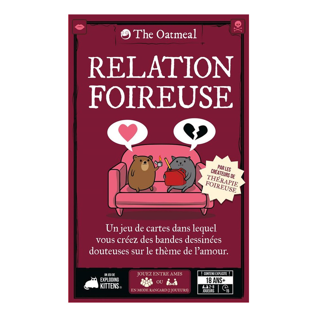 Relation Foireuse est un jeu d’ambiance pour adultes, aussi irrévérencieux qu’hilarant. À chaque manche, vous composez de mini bandes dessinées à partir de cartes illustrées sur le thème de l'amour.