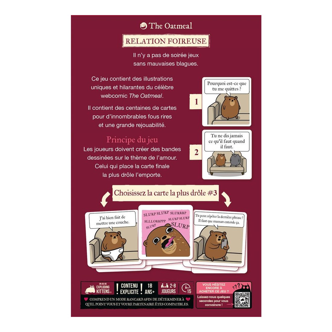 Situations absurdes, dialogues douteux et rebondissements trash... Chaque carte, signée The Oatmeal, déborde d’un humour visuel sans filtre.