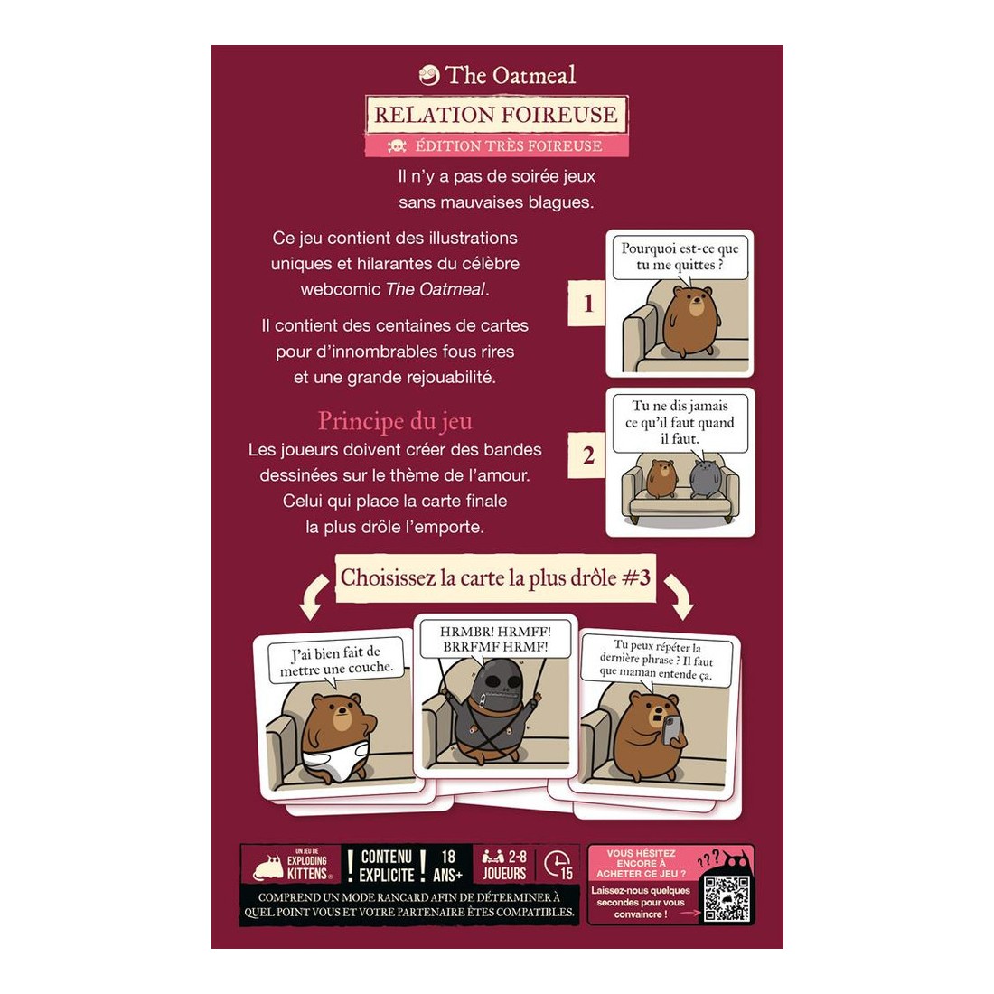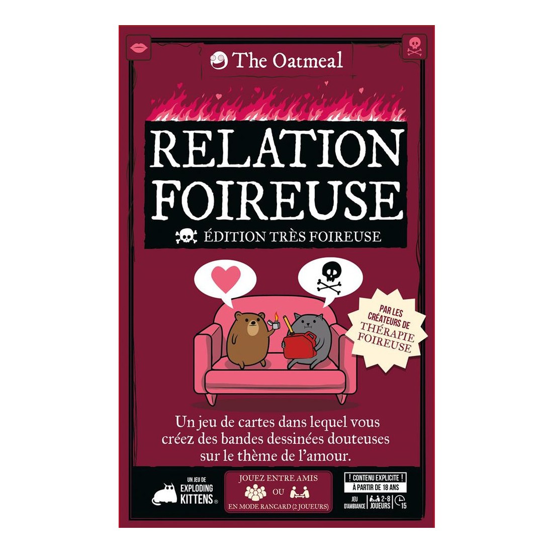 Relation Foireuse - Edition Très Foireuse est un jeu d’ambiance pour adultes, aussi irrévérencieux qu’hilarant. À chaque manche, vous composez de mini bandes dessinées à partir de cartes illustrées sur le thème de l'amour. Le but ? Créer l’histoire avec la chute la plus drôle. Et chacun sait que les histoires d'amour finissent mal, en général ! Les joueurs vont devoir convaincre le juge de la manche que leur chute est la plus appropriée. Situations absurdes, dialogues douteux et rebondissements trash... Chaque carte, signée The Oatmeal, déborde d’un humour visuel sans filtre.Un mode "rencard" permet aussi de jouer en duo, pour pimenter une soirée de date et tester sa compatibilité humoristique. Idéal entre amis, en couple ou pour briser la glace. Relation Foireuse - Edition Très Foireuse contient encore plus de cartes que la version classique.