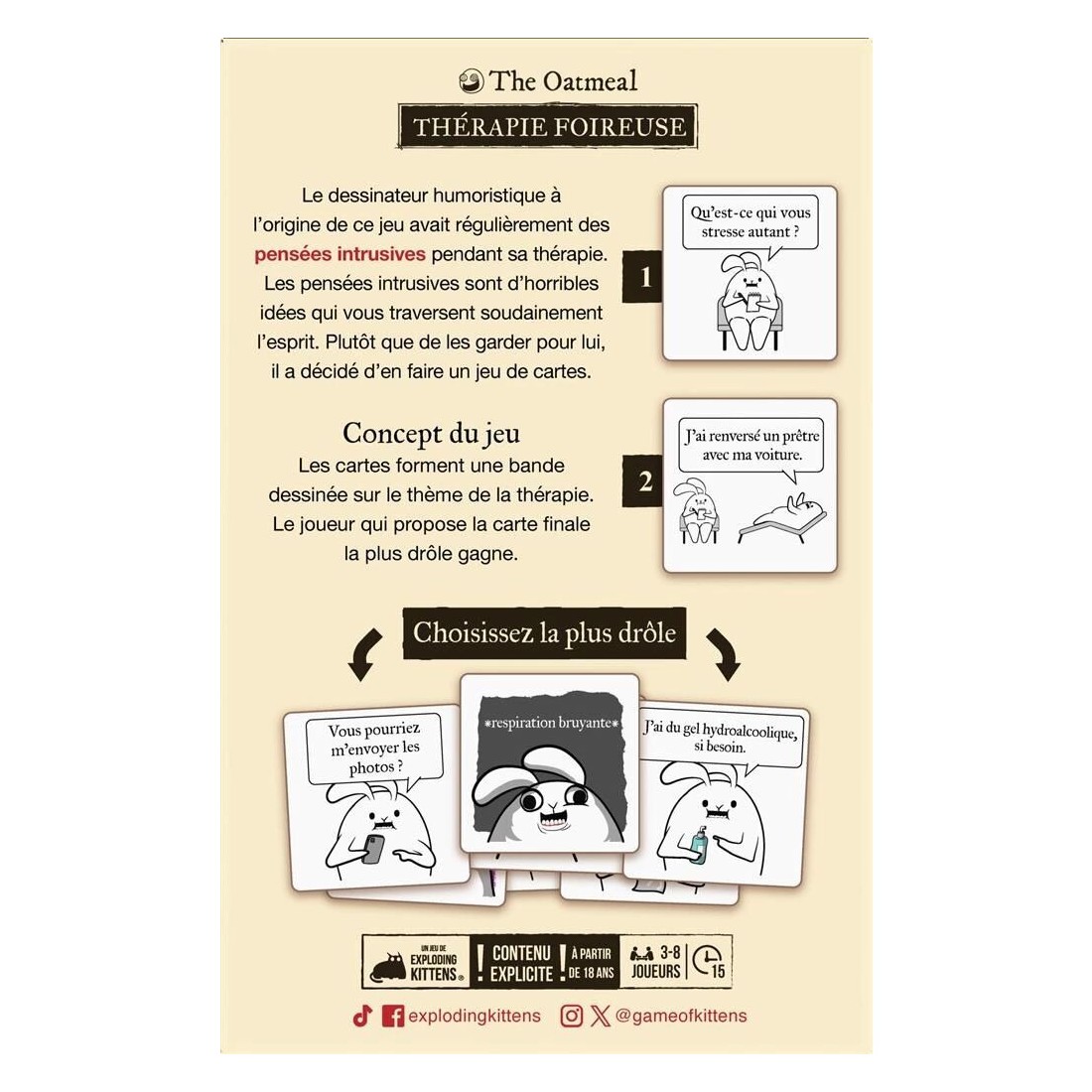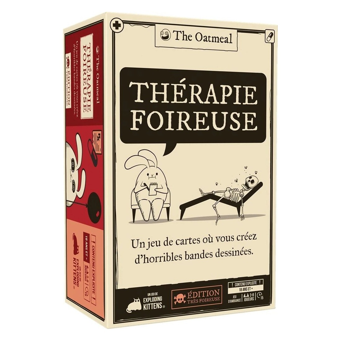 Thérapie Foireuse - Édition Très Foireuse est un jeu de société d'ambiance jouable de 3 à 8 joueurs, dès 18 ans pour des parties de 15 minutes, édité par Exploding Kittens.