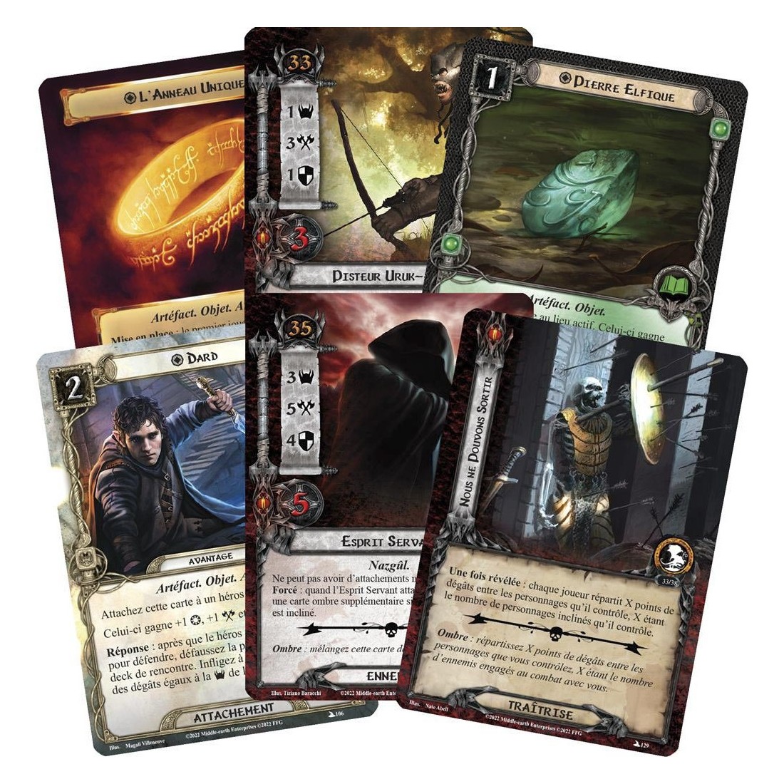 Frodon Sacquet et ses compagnons viennent tout juste de commencer leur quête légendaire pour détruire l'Anneau Unique et vaincre Sauron. Mais prenez garde, le voyage est semé d'embûches, des brutaux Uruk-hai au terrifiant Balrog, sans parler des redoutables Nazgûl qui les traquent à chaque pas. Mais même face à un tel péril, Frodon et ses compagnons doivent continuer — le sort de la Terre du Milieu en dépend !Vous devrez gérer L'Anneau Unique et son porteur, Frodon, dont vous devrez choisir une version parmi les deux proposées. Une nouvelle sphère d'influence, la sphère de Communauté, fait son apparition, et sera étoffée au fil des prochaines extensions. Toutes les cartes de cette boîte ont été précédemment publiées dans les extensions Les Cavaliers Noirs et La Route s'Assombrit, sorties en 2014, et épuisées depuis longtemps.