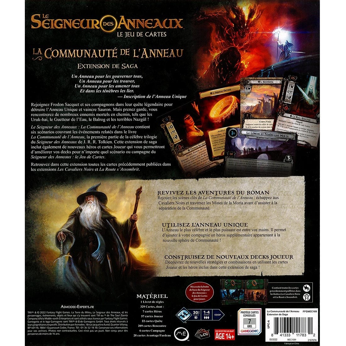 Seigneur des Anneaux Jce : La Communauté de l'Anneau - Extension Saga contient 329 Cartes, dont : 7 cartes Héros 57 cartes Joueur 22 cartes Quête 209 cartes Rencontre 6 cartes Campagne 28 cartes Avantage/Fardeau- Age : dès 14 ans