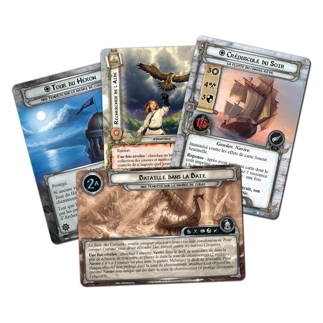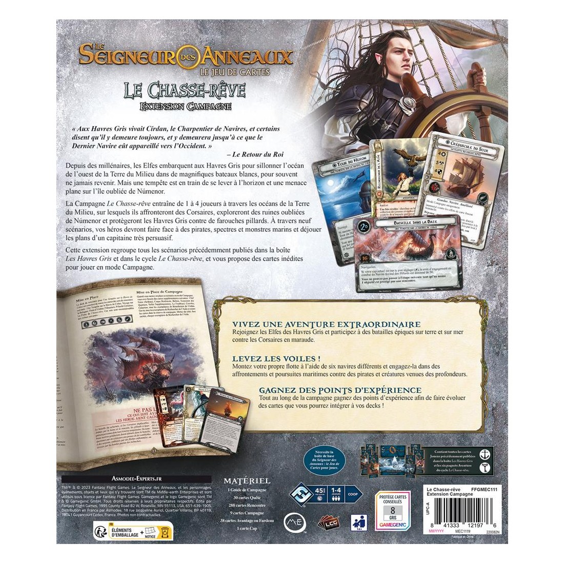 La Campagne Le Chasse-rêve entraîne de 1 à 4 joueurs à travers les océans de la Terre du Milieu, sur lesquels ils affronteront des Corsaires, exploreront des ruines oubliées de Númenor et protègeront les Havres Gris contre de farouches pillards. À travers neuf scénarios, vos héros devront faire face à des pirates, spectres et monstres marins et déjouer les plans d’un capitaine très persuasif.